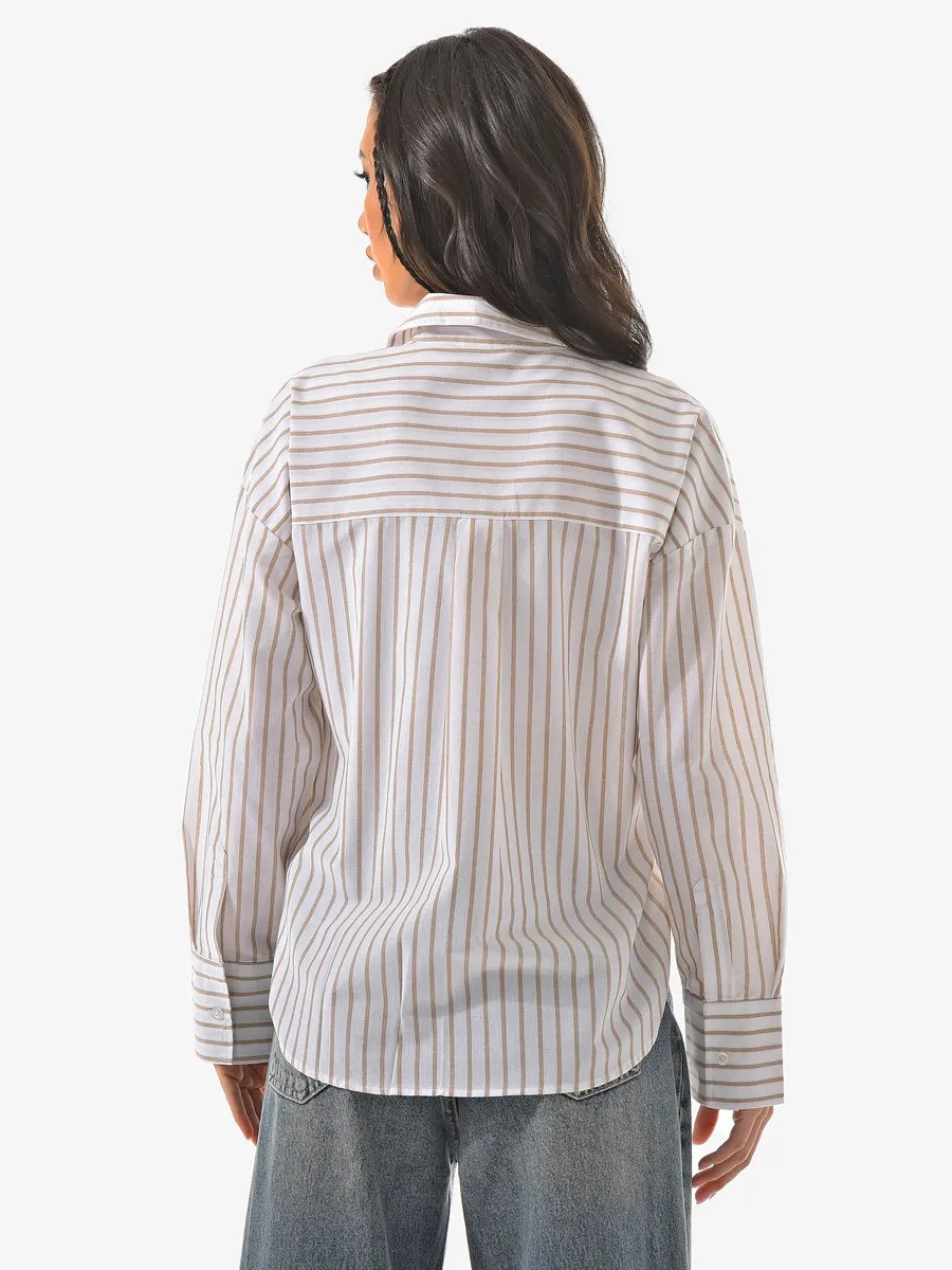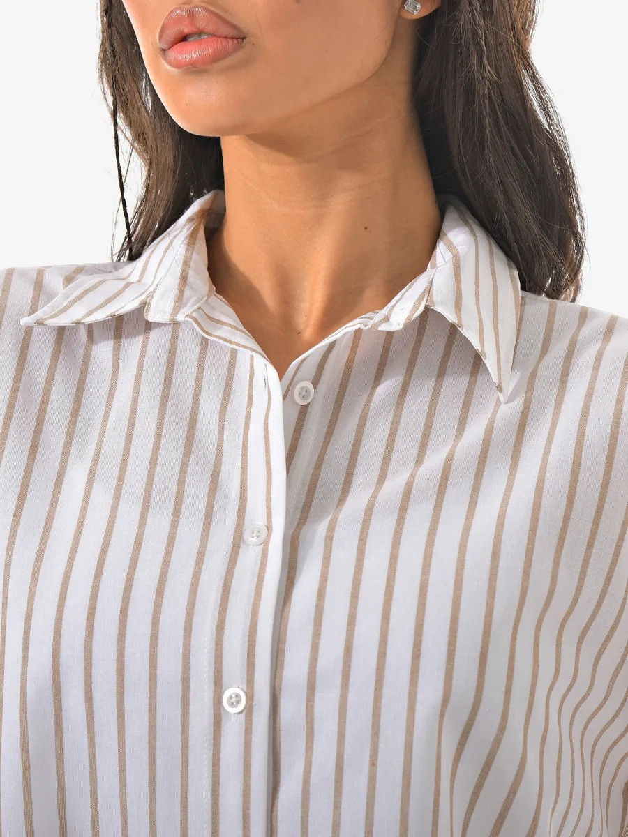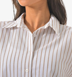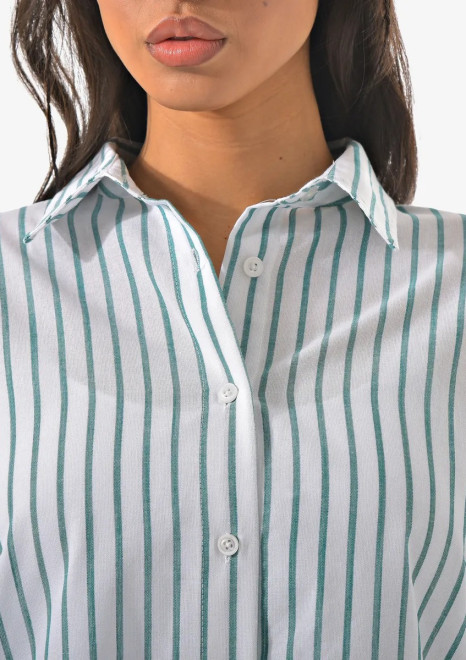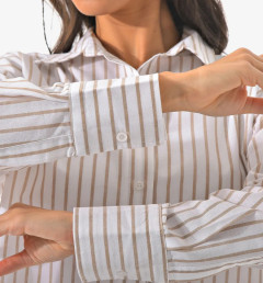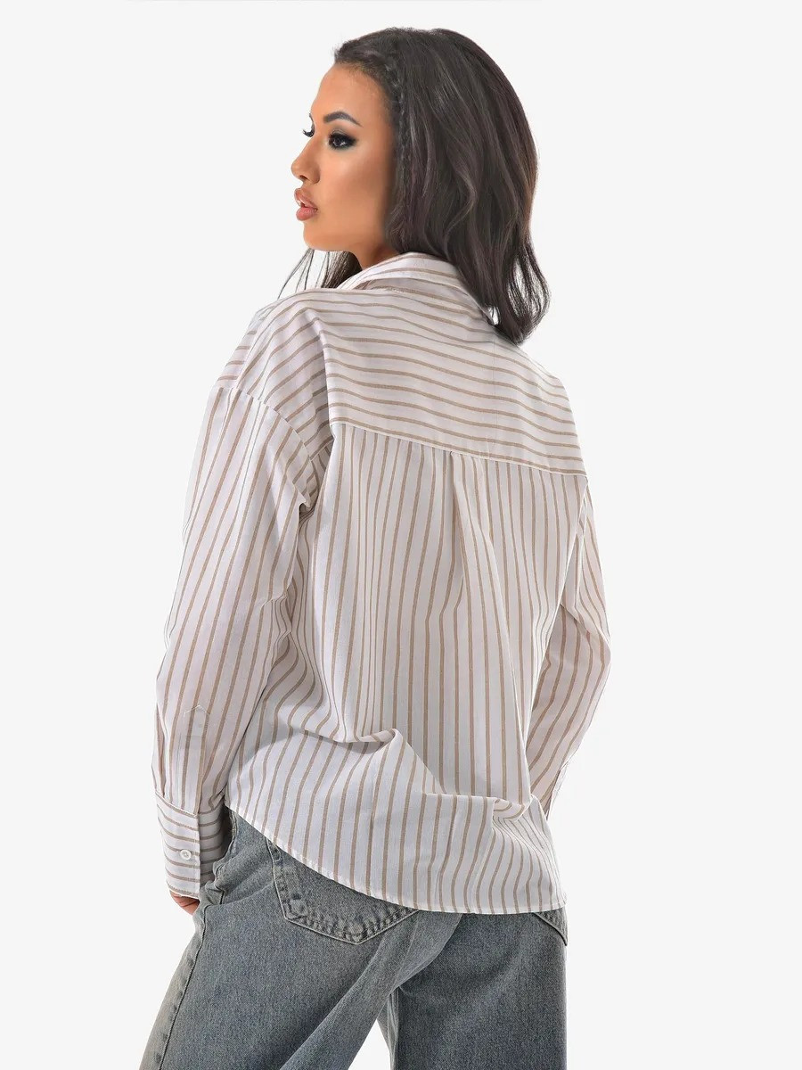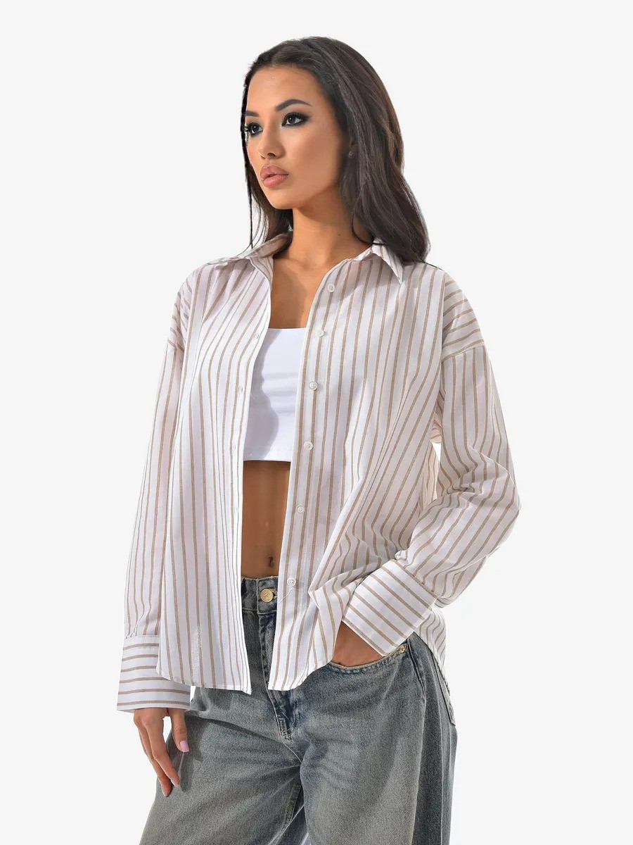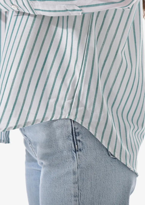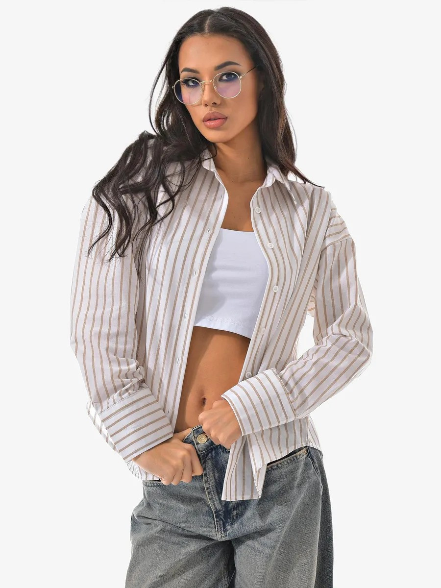 Эта хлопковая рубашка в полоску с v-образным вырезом станет настоящей находкой для вашего гардероба. Она отличается свободным кроем и выполнена из высококачественного турецкого хлопка, который гарантирует комфорт и уют.