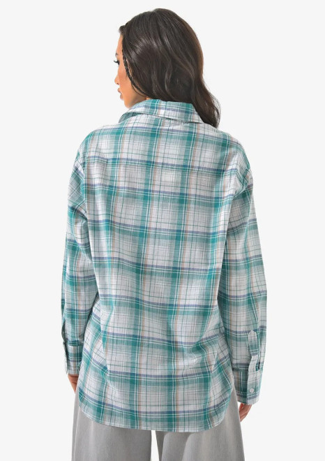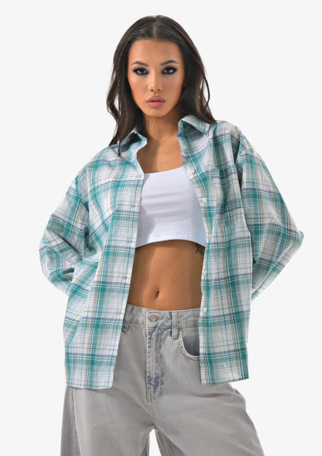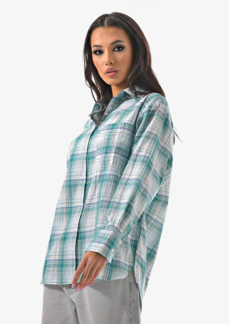 Рубашка имеет опущенное плечо и достаточно свободный силуэт, что позволяет носить её в любое время года.