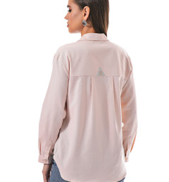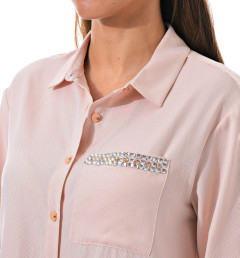 Рубашка украшена камнями и стразами на кармане, а также красивыми пуговицами, которые придают ей изысканный вид. Благодаря своему дизайну, она подойдёт для различных случаев — от повседневной носки до особых мероприятий.
