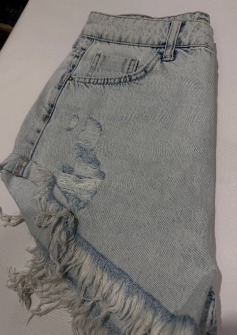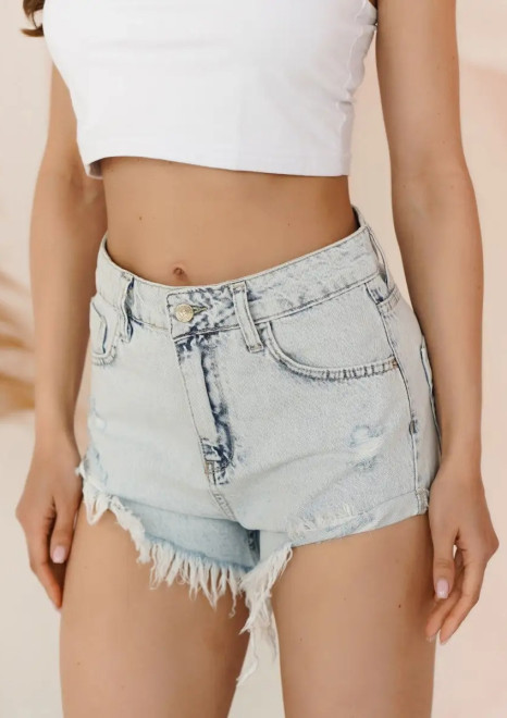Шорты удлиненного кроя с высокой посадкой. Декорированы бахромой и разрезами по бокам брючин.