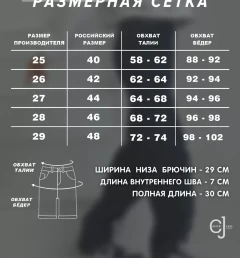 Модель выполнена в размере 26. Длина шорт составляет 30 см, длина внутреннего шва — 7 см, а ширина низа брючин — 29 см. При выборе размера рекомендуем воспользоваться таблицей в разделе «ФОТО»!