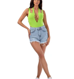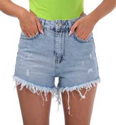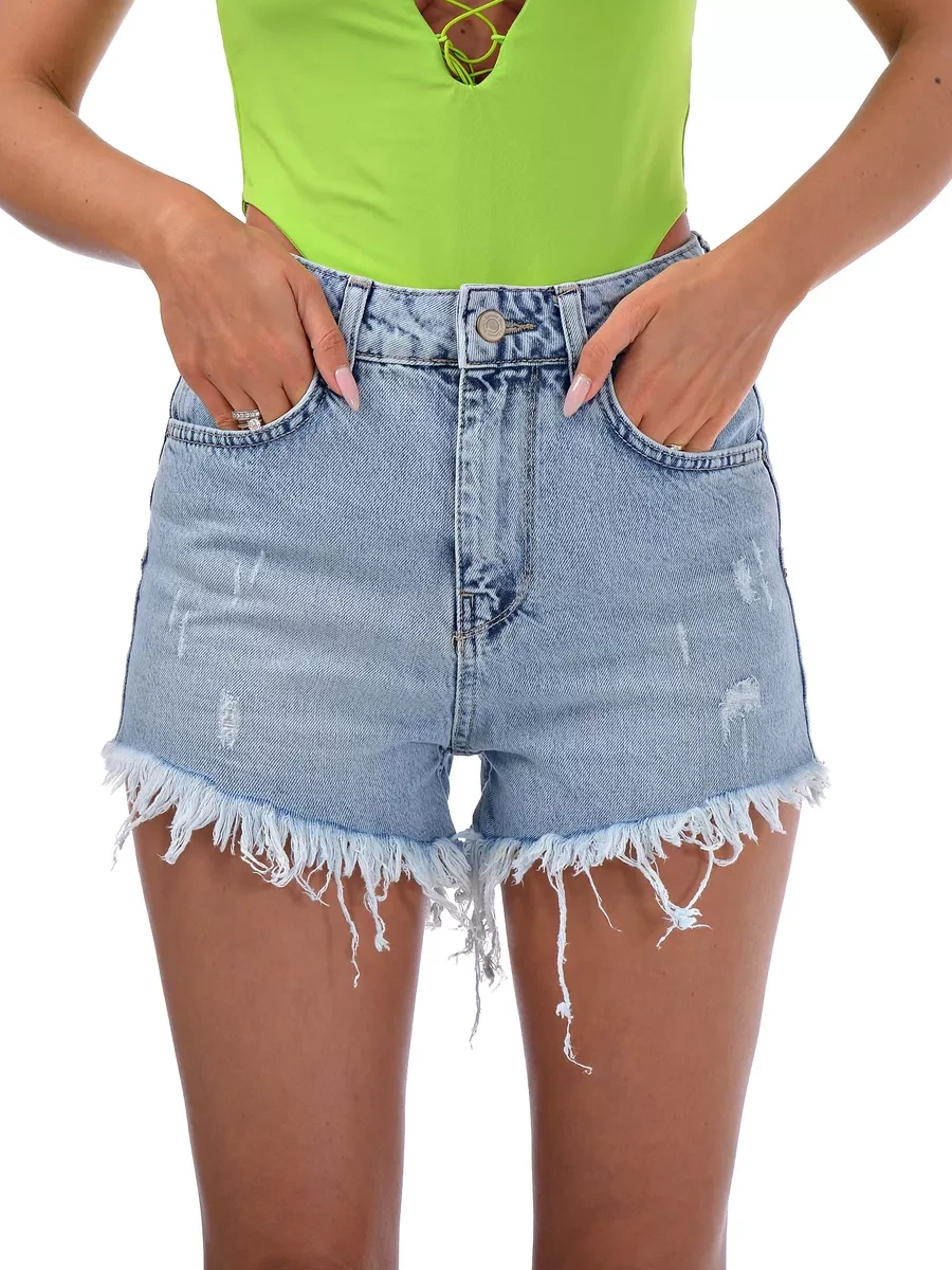 Представляем вам молодежные голубые джинсовые шорты с потертостями и рваными дырками, а также с обработанным краем в виде бахромы.
