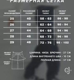 Размер 25. Длина изделия — 37 см, длина внутреннего шва — 10 см, ширина низа брючин — 27 см. При выборе размера ориентируйтесь на таблицу в разделе «Фото»!