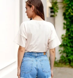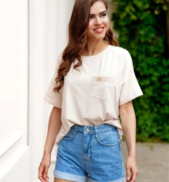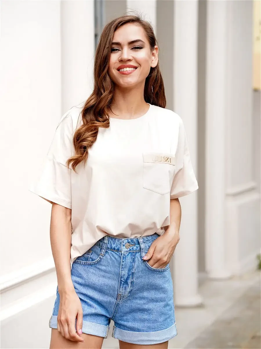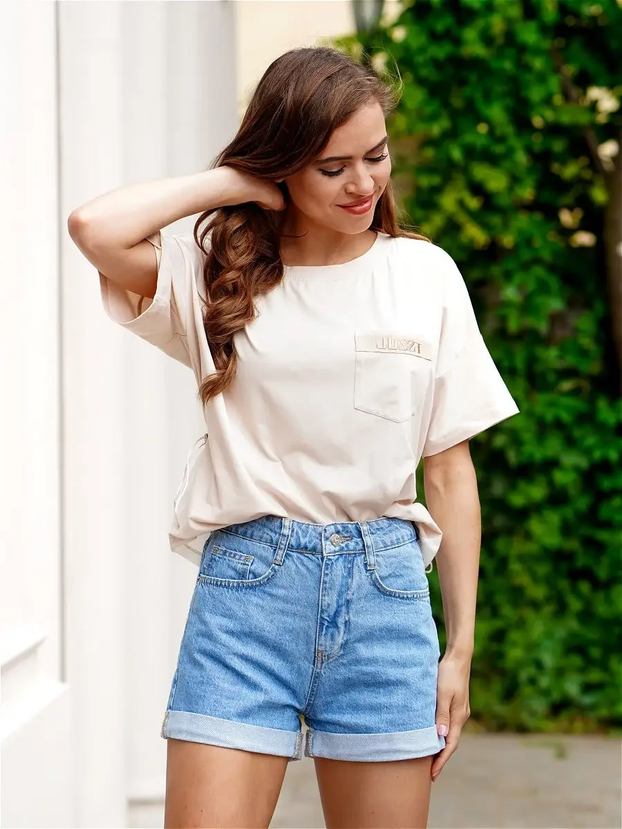 Шорты женские бренда CRACPOT с подворотом и потертостями. Женские джинсовые шорты, выполненные из хлопкового материала. Модель застегивается на молнию и металлическую пуговицу, дополнена шлевками для ремня.