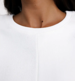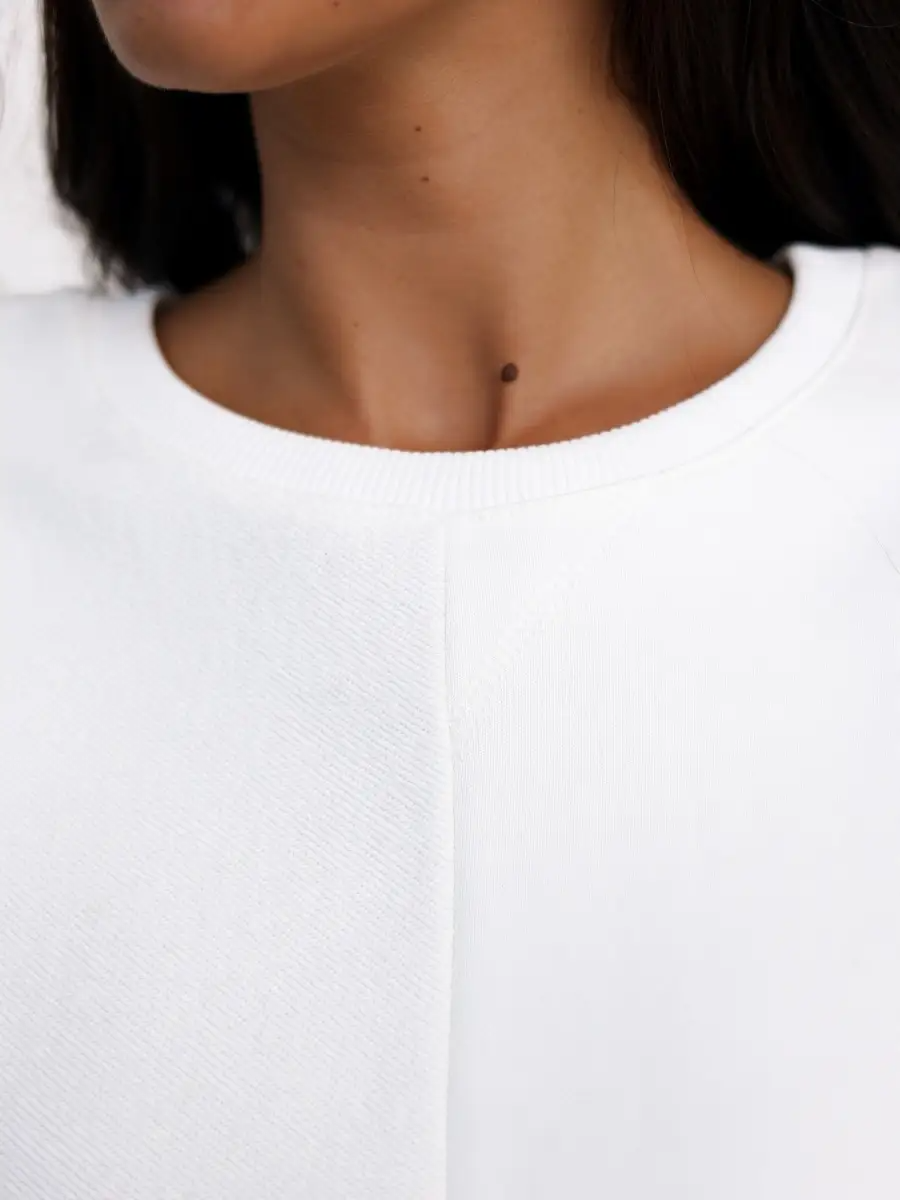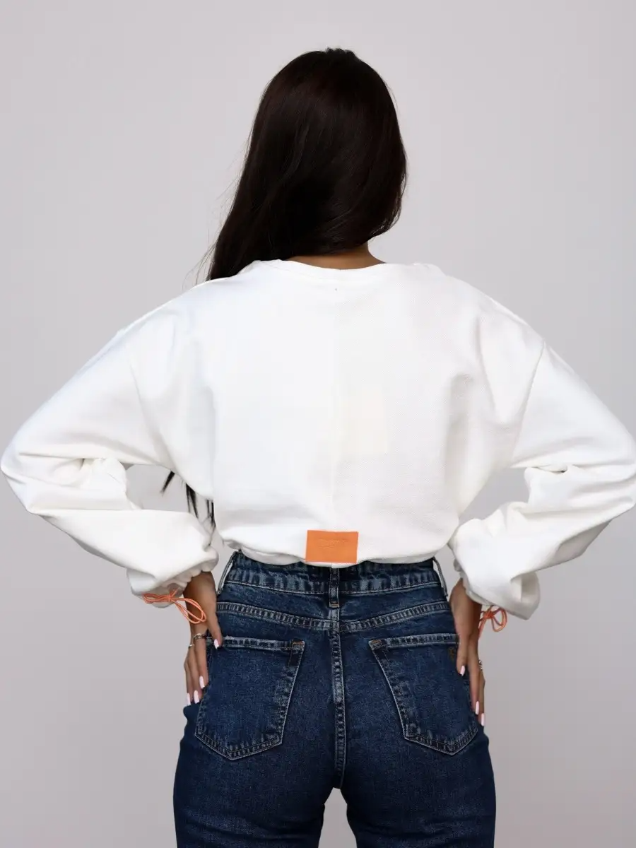 Отличительной чертой этой модели является шнурок, который проходит по низу свитшота. С его помощью можно создавать разнообразные образы, затягивая и ослабляя шнурок. Кроме того, его можно вообще убрать, что позволит сохранить прямой силуэт свитшота.
