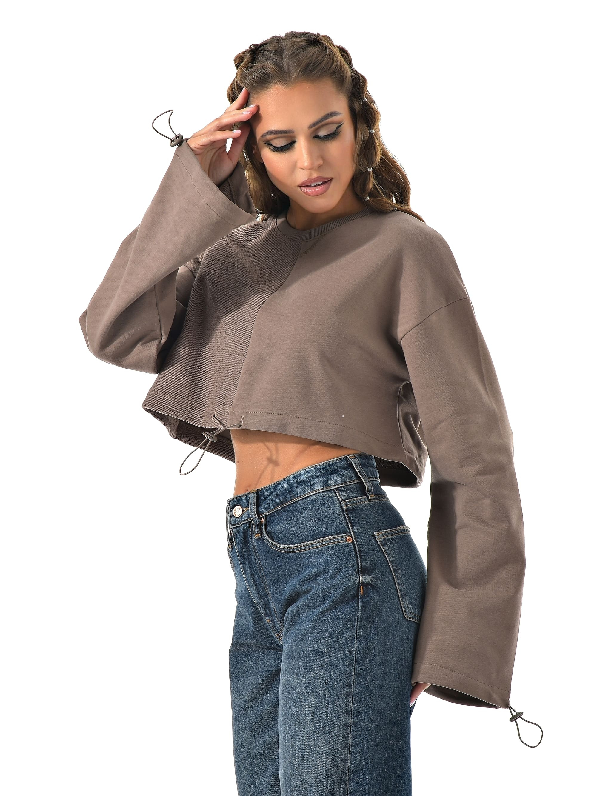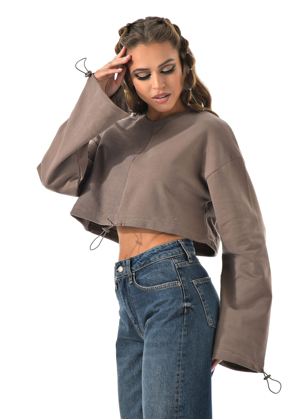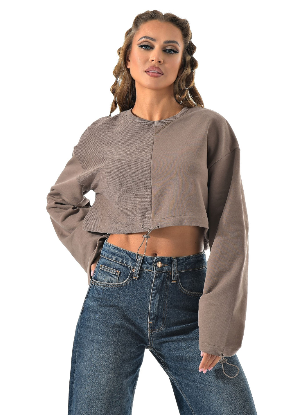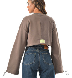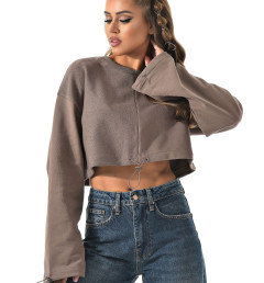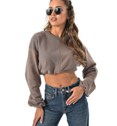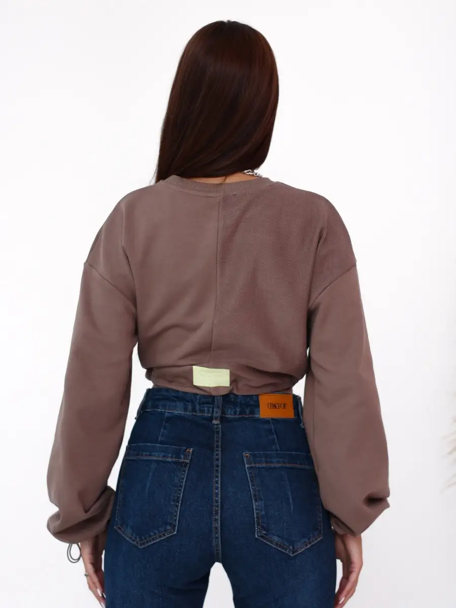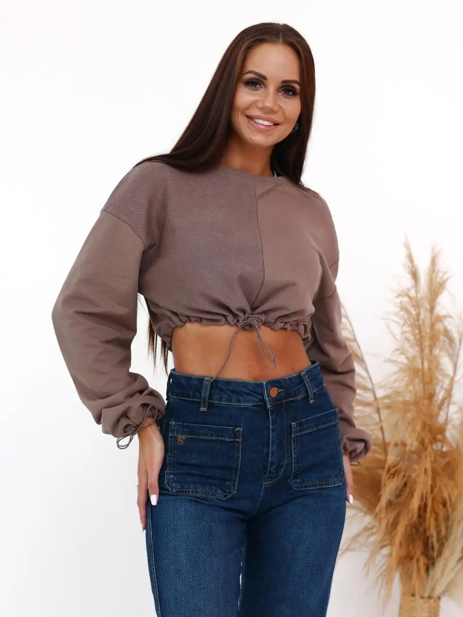 Укороченный свитшот бренда CRACPOT это образец женской молодежной моды удобный стильный. По низу проходит шнурок для смены образов можно затянуть или носить свободно .