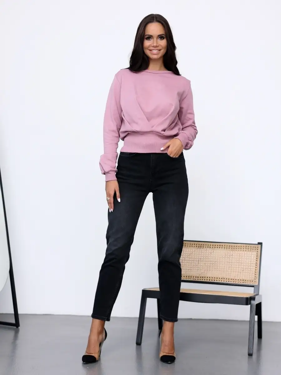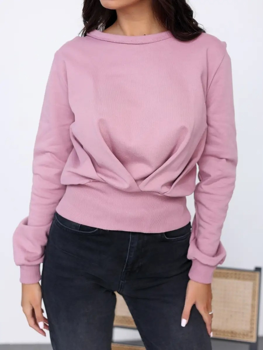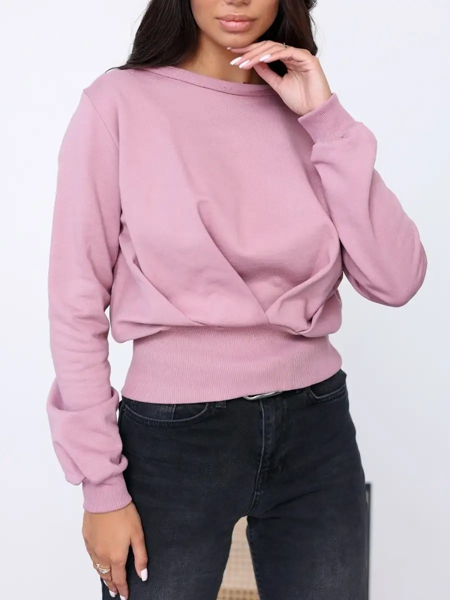 Эластичные манжеты, пояс. Круглый вырез горловины. Модная толстовка без рисунка.