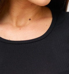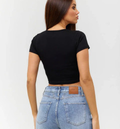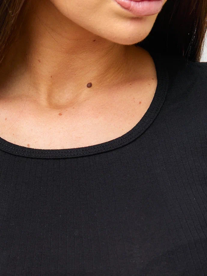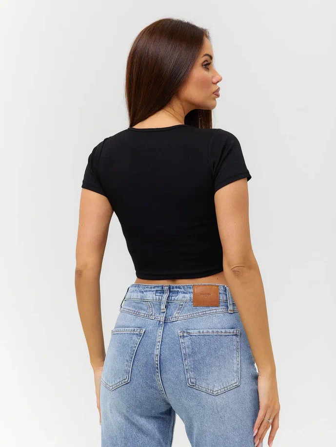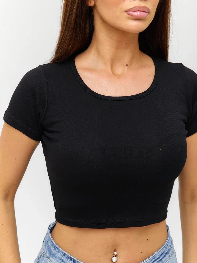 Кроп топ Kota черного цвета, с короткими рукавами и с круглым вырезом. Ткань в рубчик.