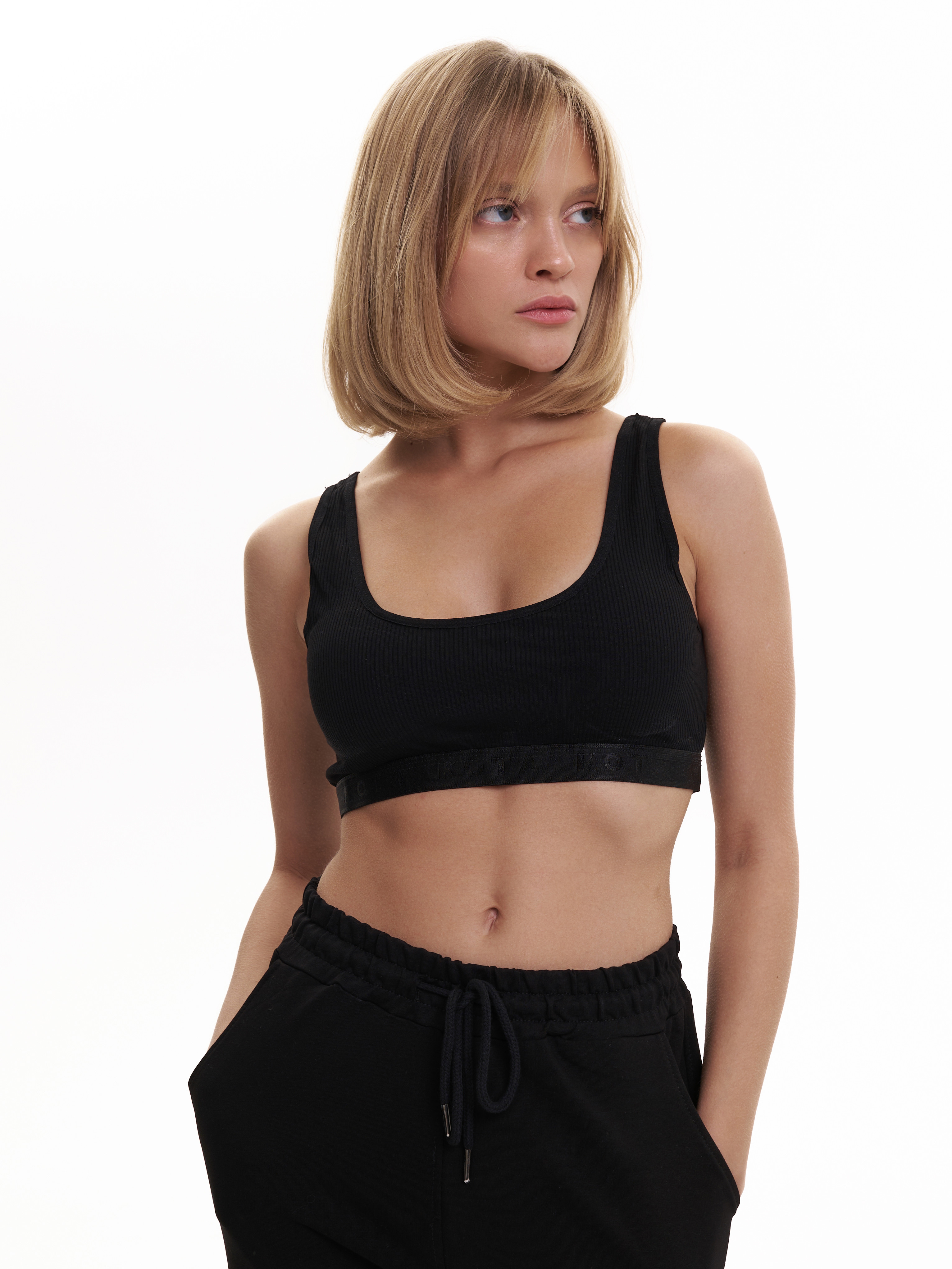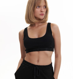 Спортивный топ Kota черного цвета на широких бретелях с пушап вставками. Ткань в рубчик.
