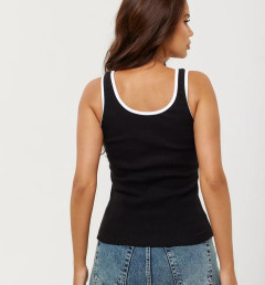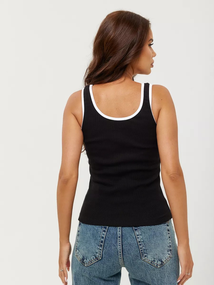 Летний топ декорирован планкой с пуговицами, что делает его универсальным элементом гардероба, который легко сочетается с другими вещами и позволяет создавать разнообразные образы.