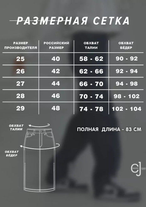 Полная длина 83, длина разреза 42 см. Рост модели на фото 173 см. Параметры модели 89-62-93. Размер на модели 25. При выборе размера, просим пользоваться таблицей размеров, в разделе ФОТО.