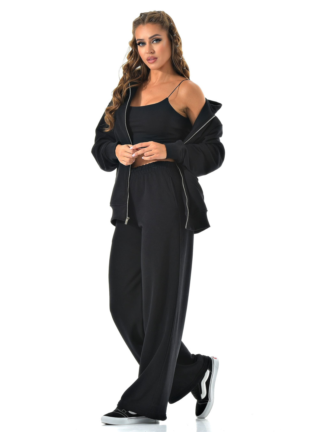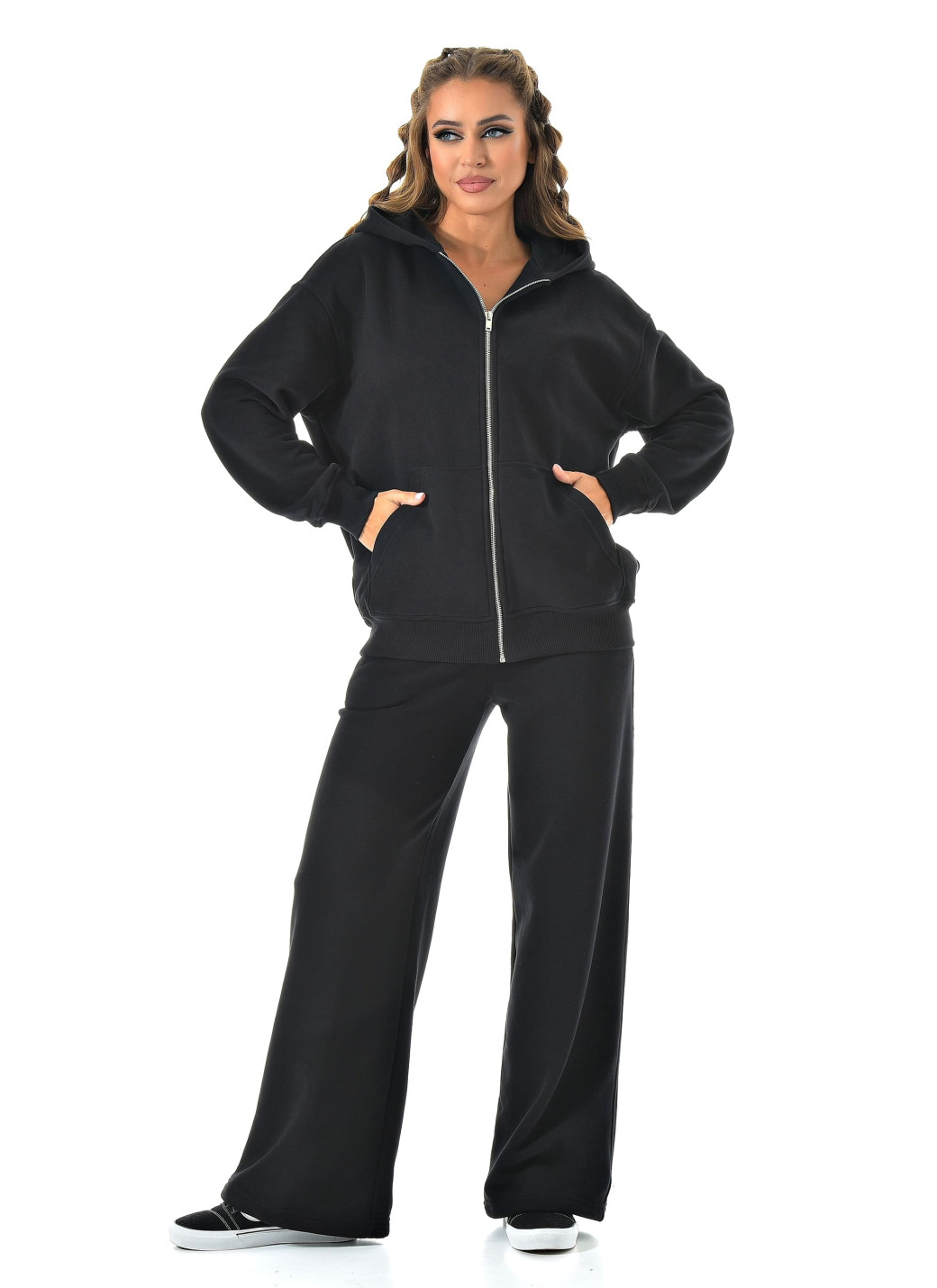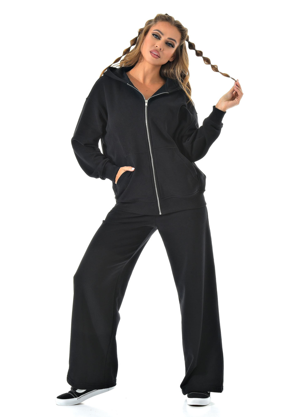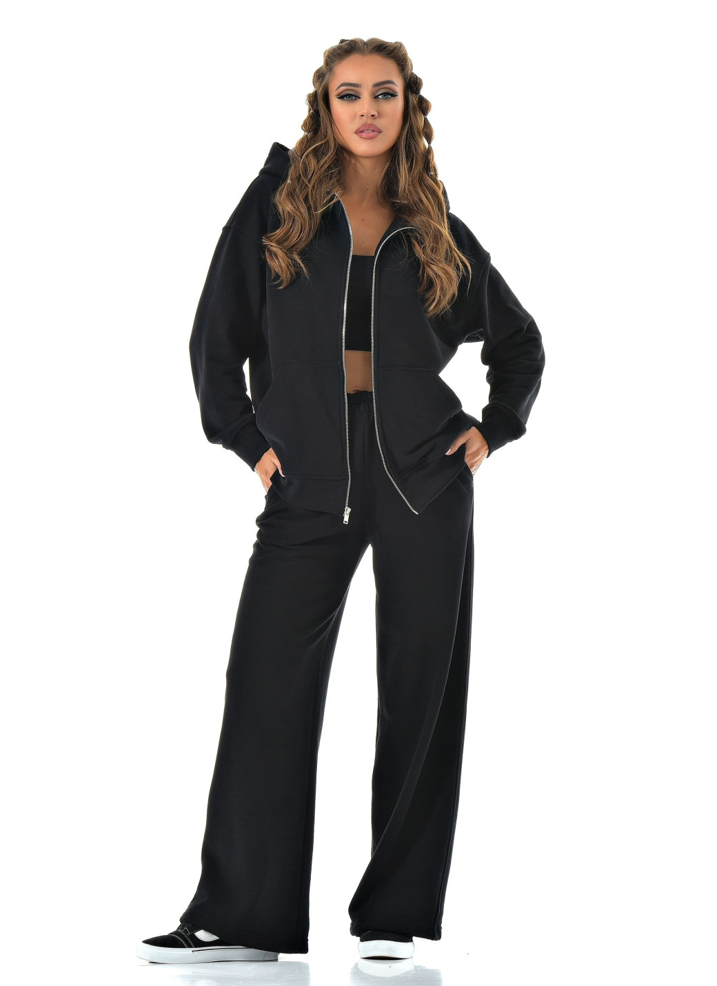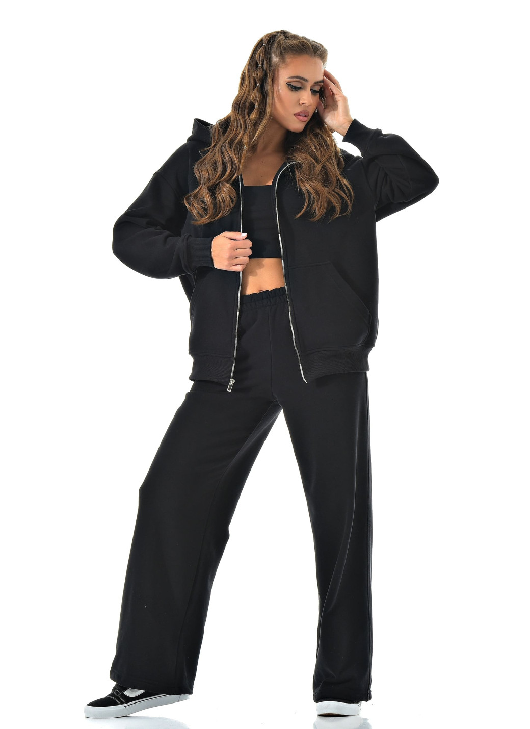 Прямые широкие брюки визуально вытягивают ноги, а молния сверху позволяет регулировать настроение образа — от спортивного до минималистичного casual.