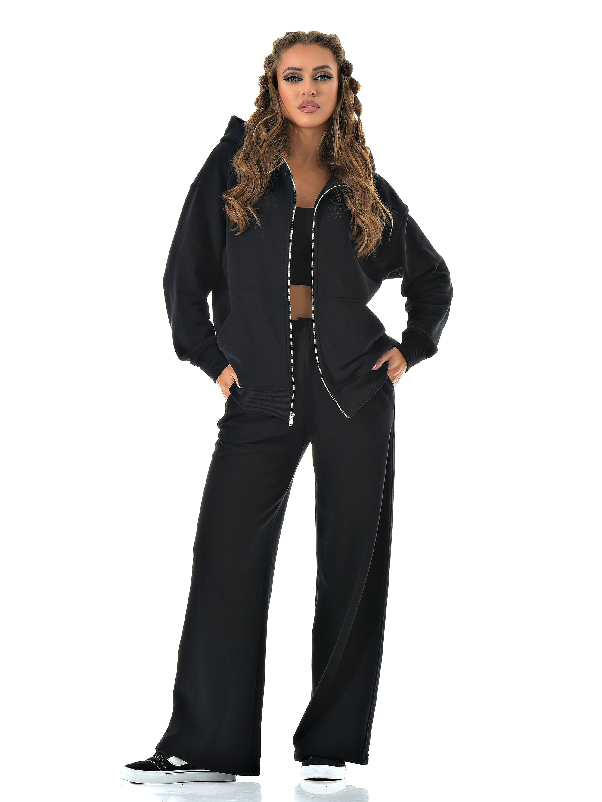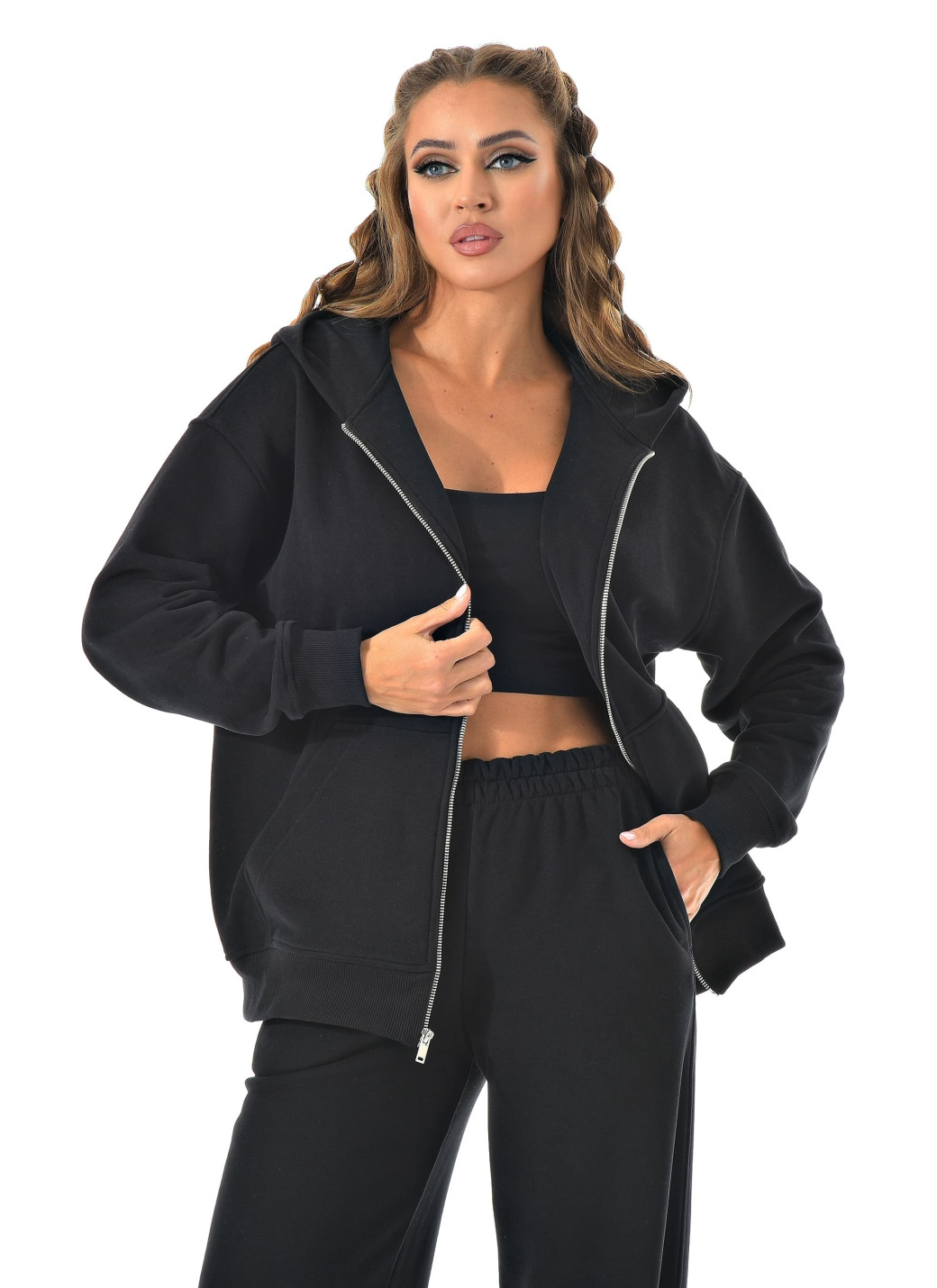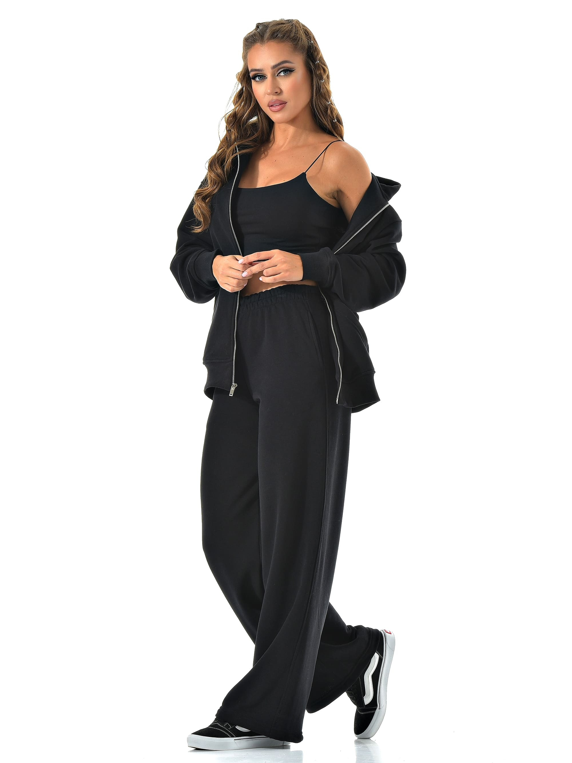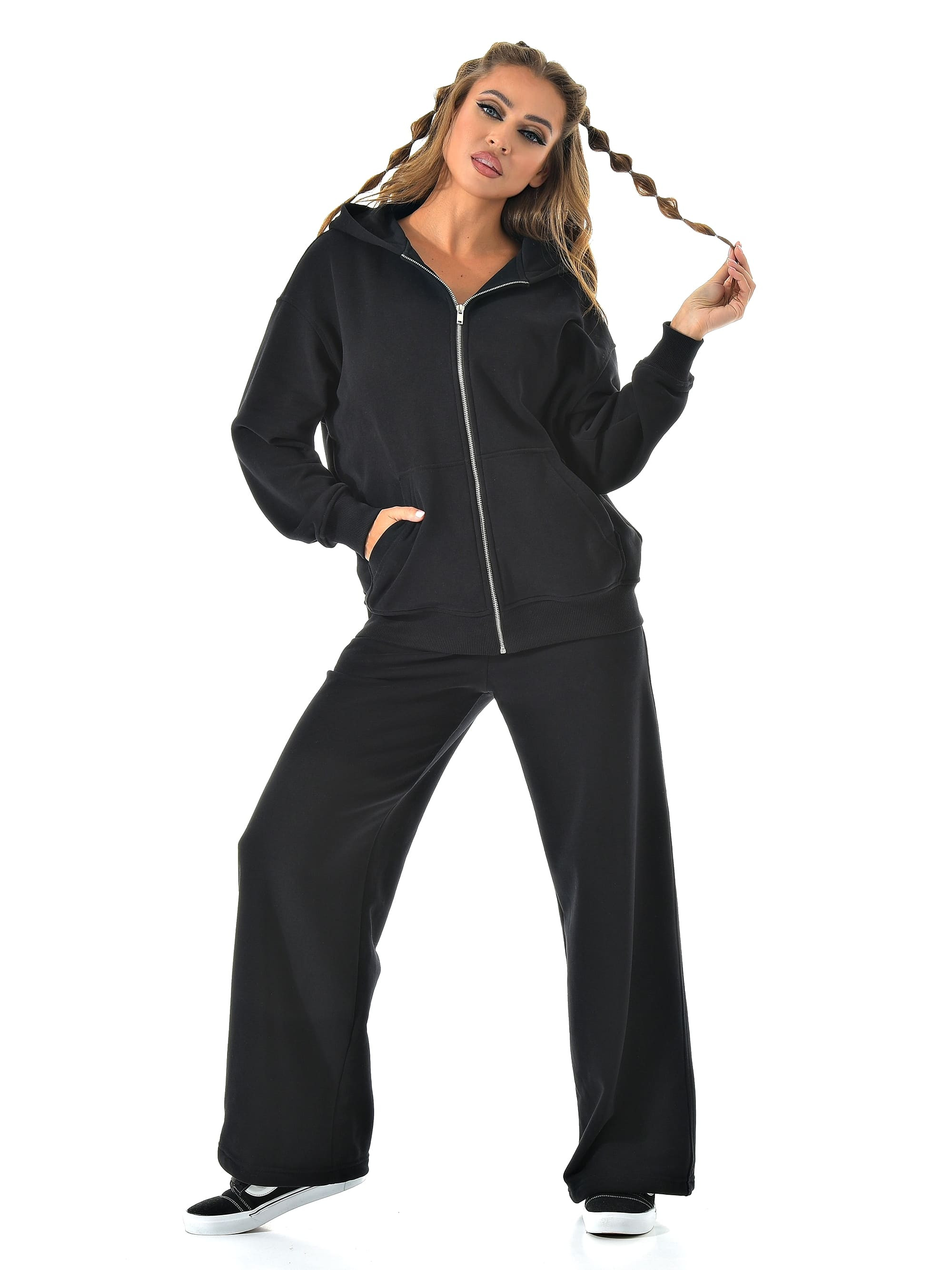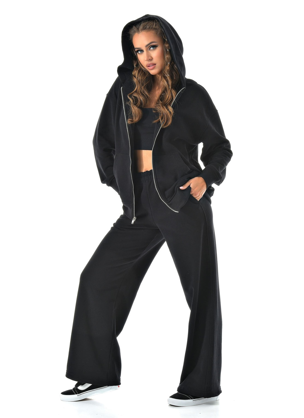 Прямые широкие брюки визуально вытягивают ноги, а молния сверху позволяет регулировать настроение образа — от спортивного до минималистичного casual.