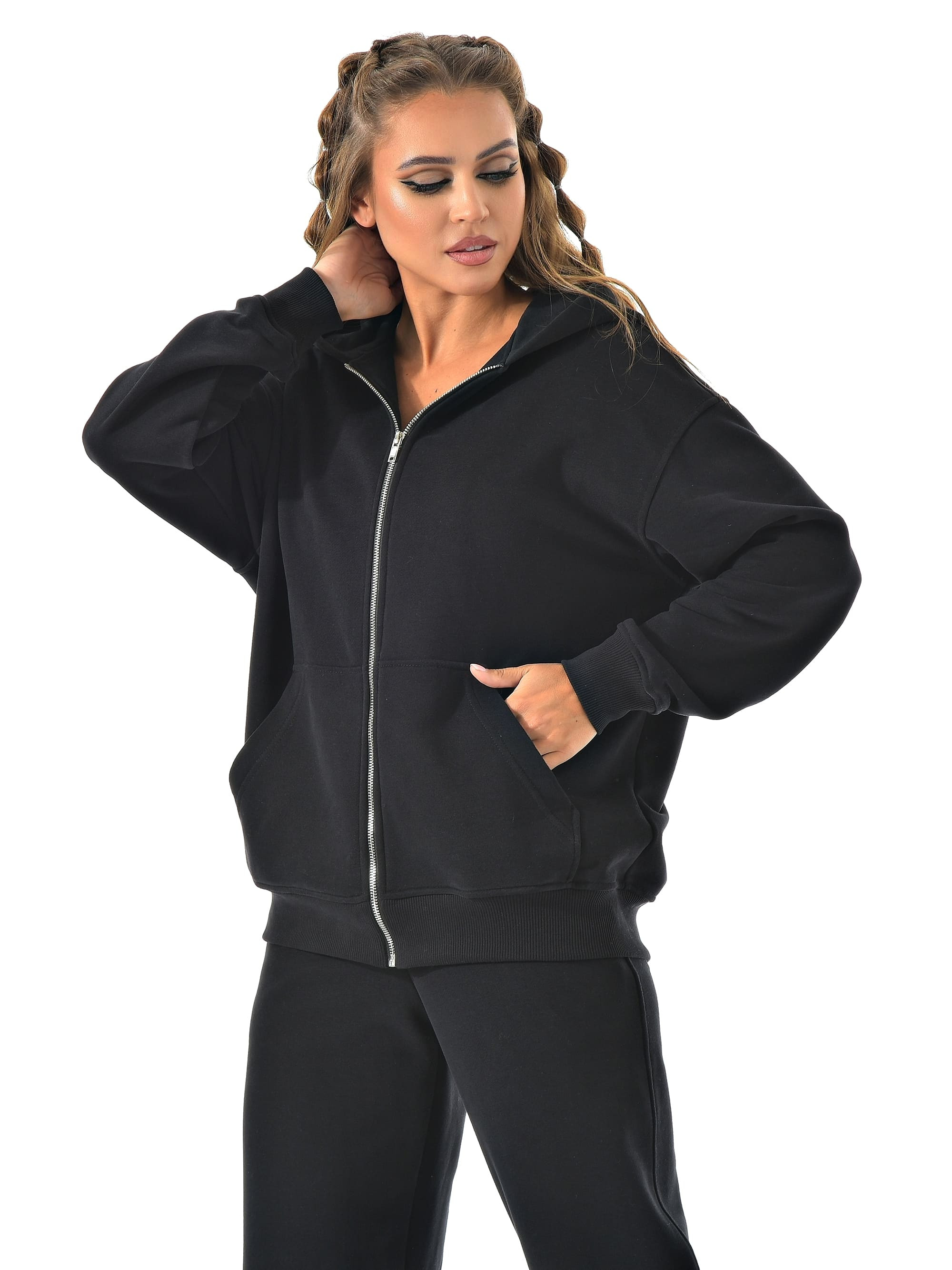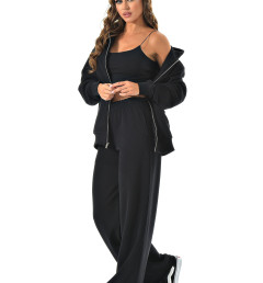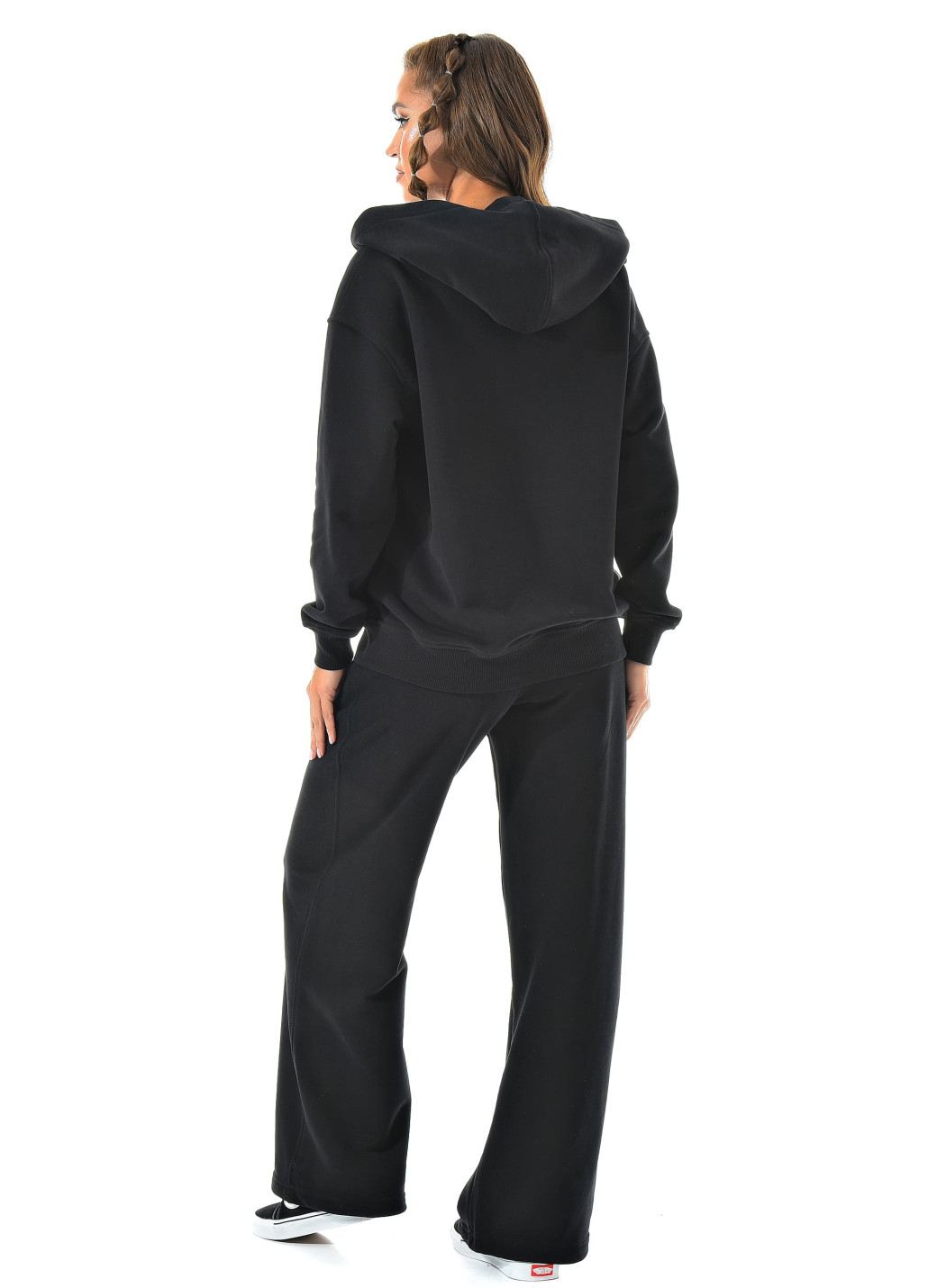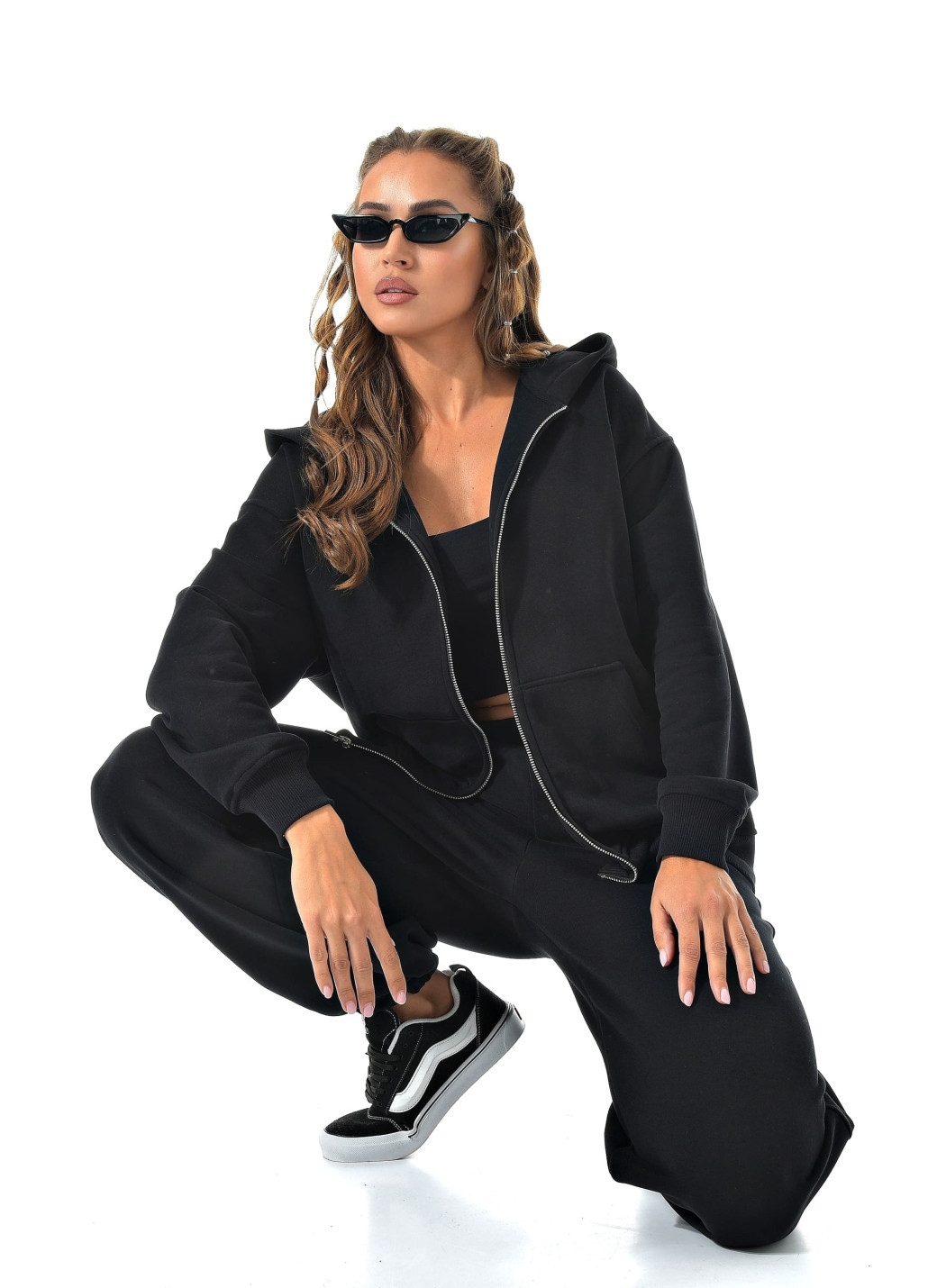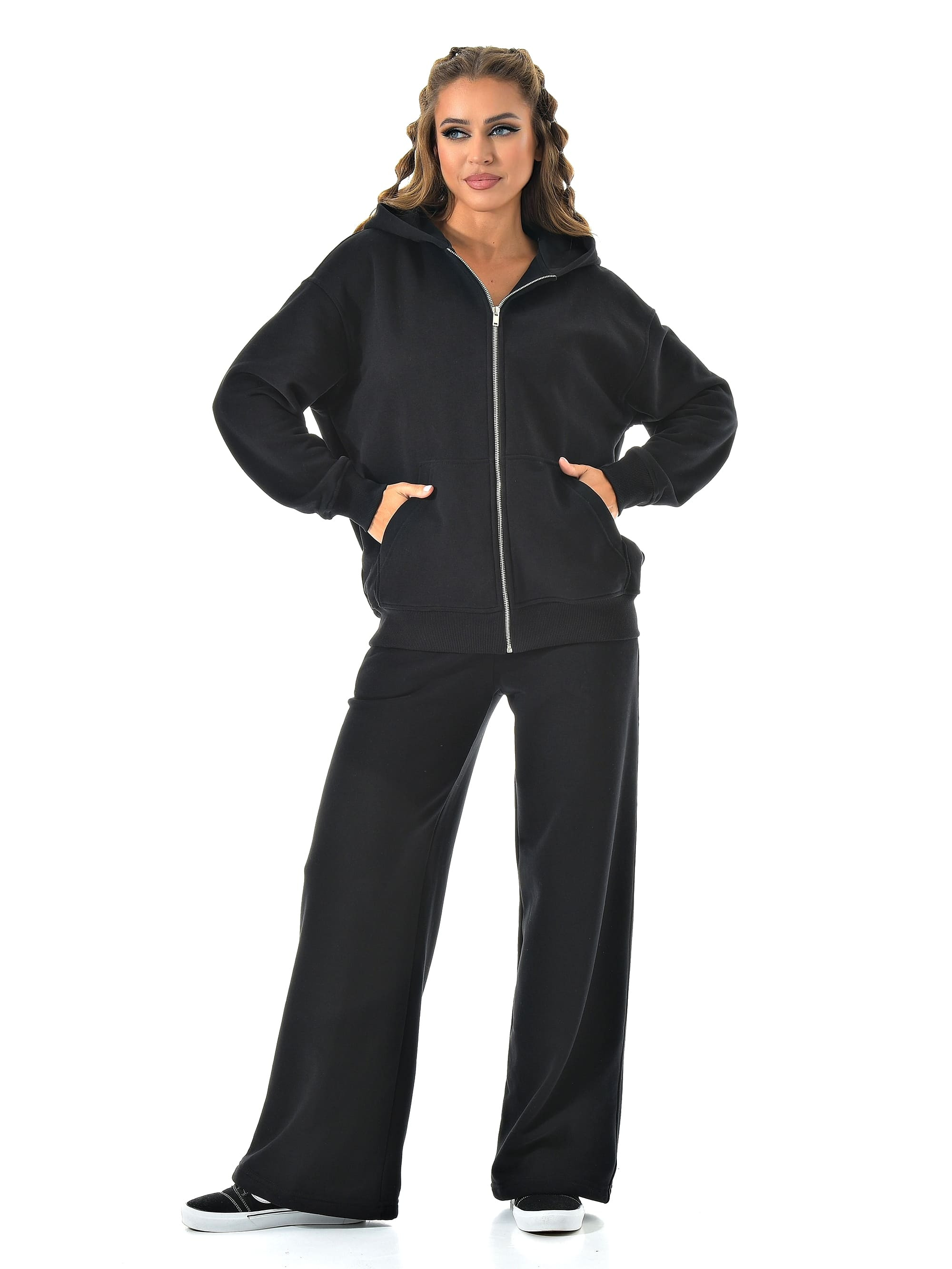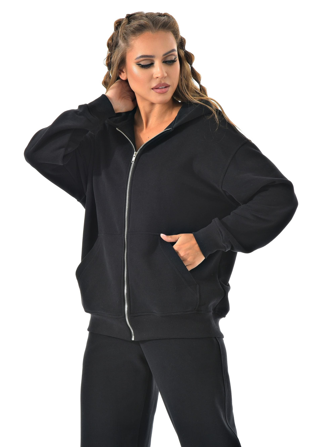 Прямые широкие брюки визуально вытягивают ноги, а молния сверху позволяет регулировать настроение образа — от спортивного до минималистичного casual.