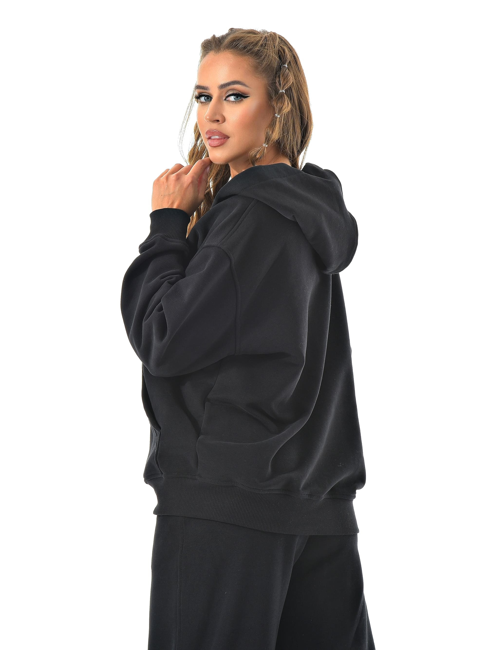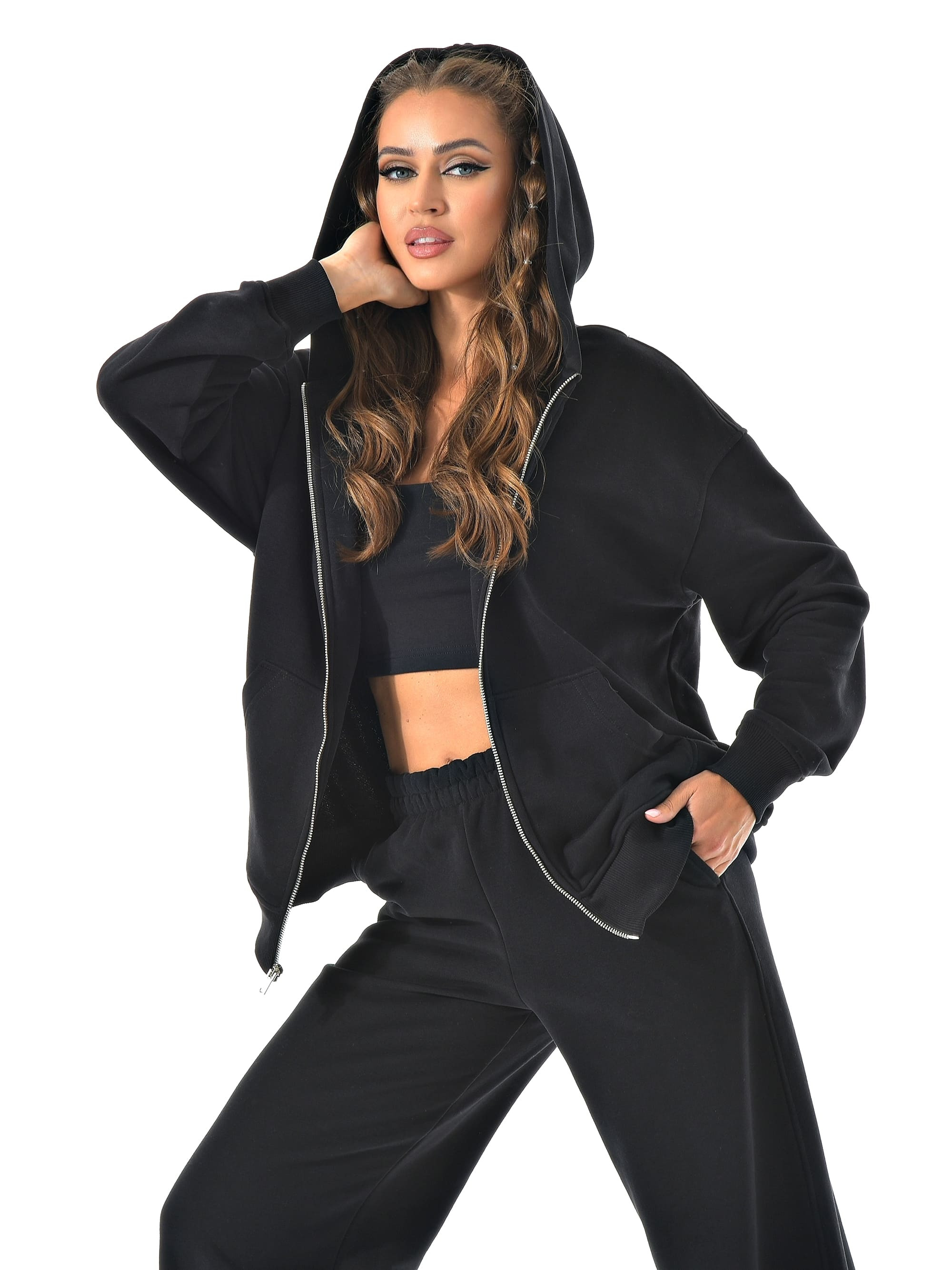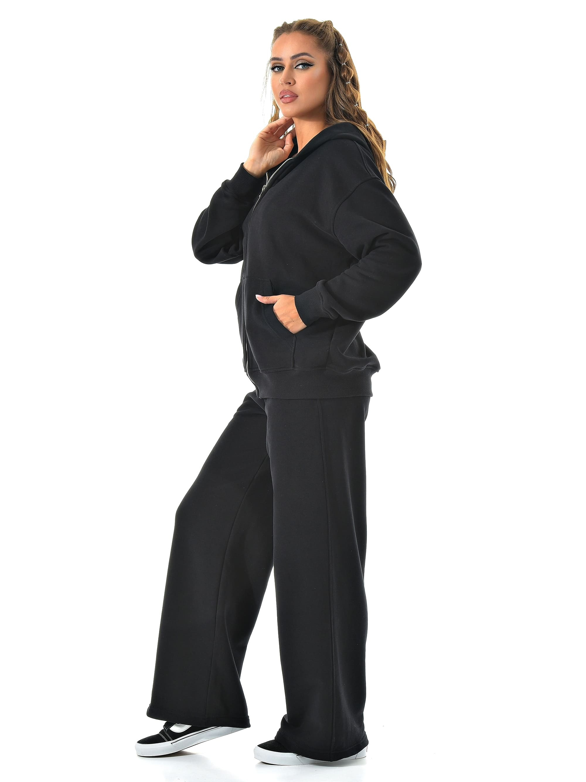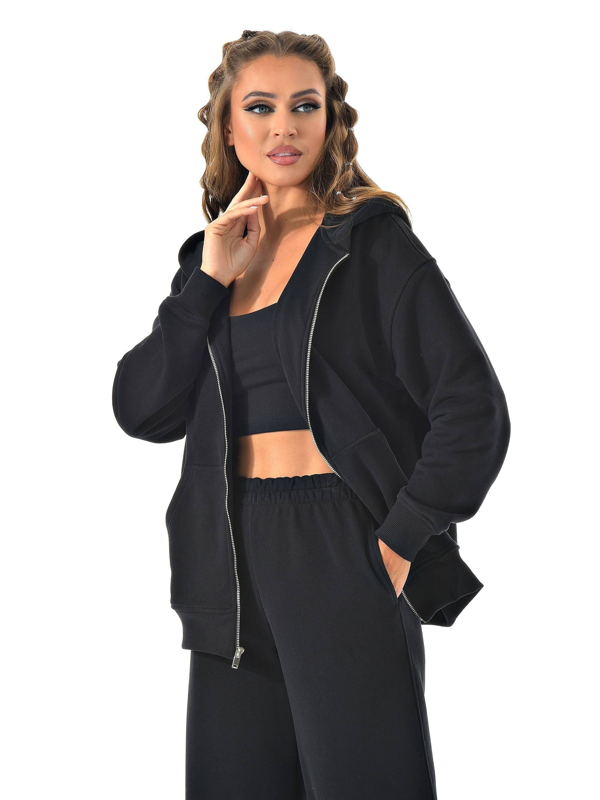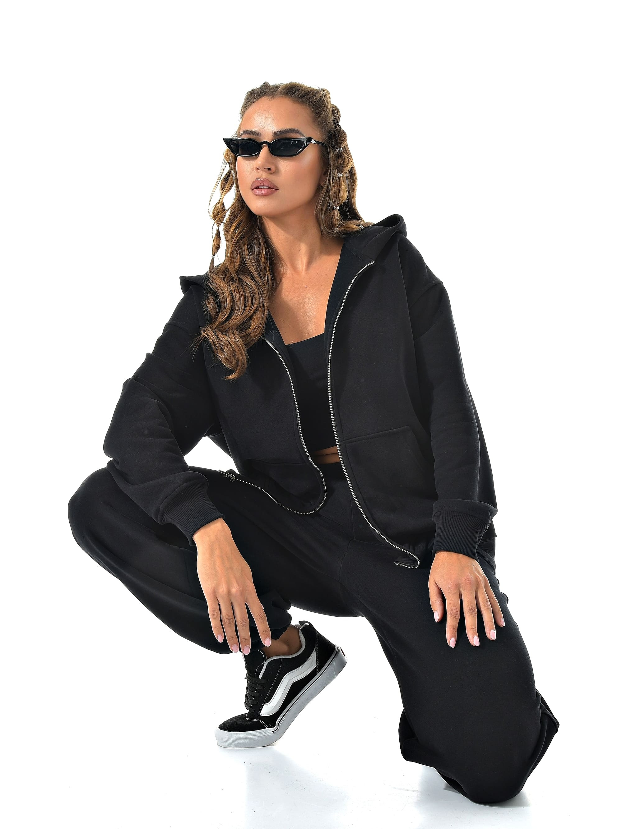 Прямые широкие брюки визуально вытягивают ноги, а молния сверху позволяет регулировать настроение образа — от спортивного до минималистичного casual.