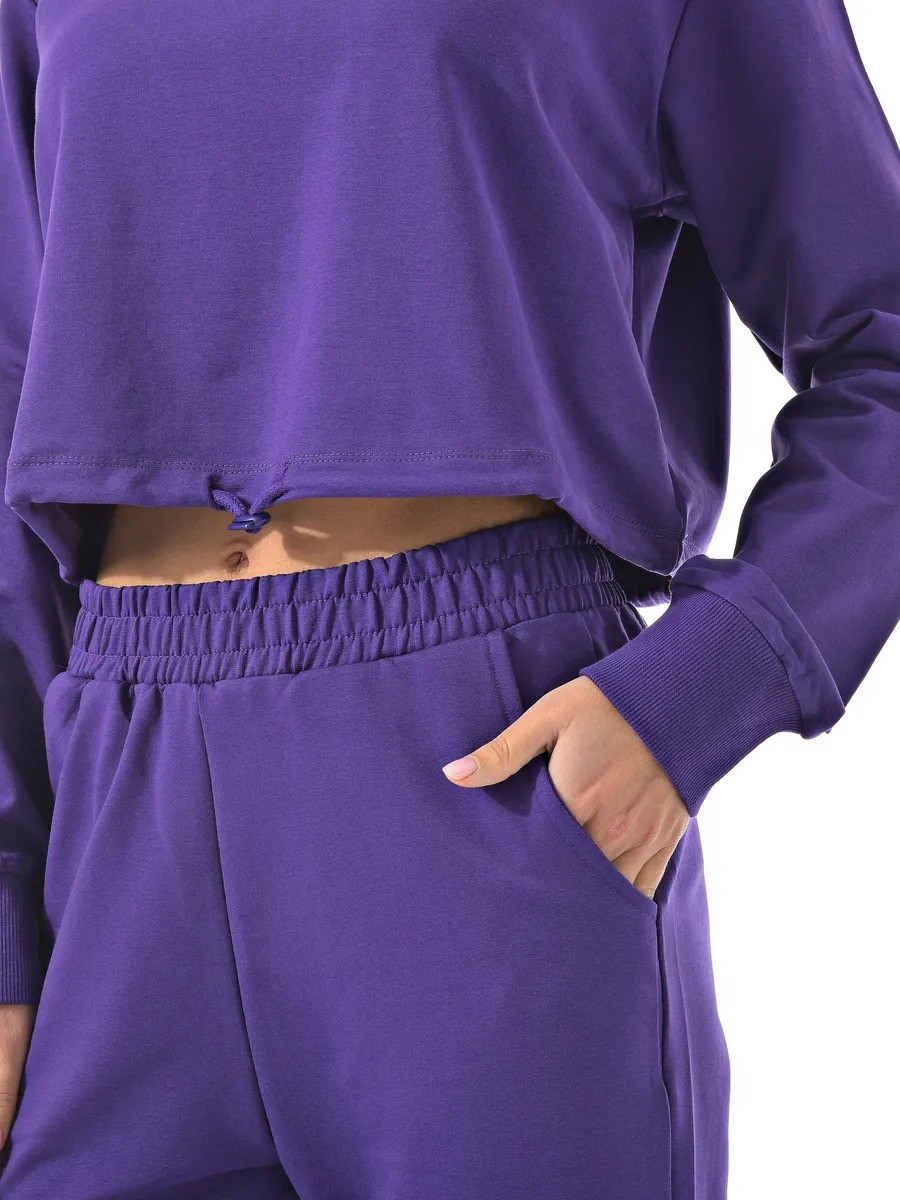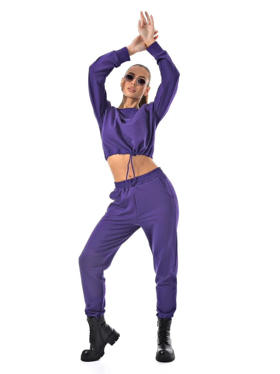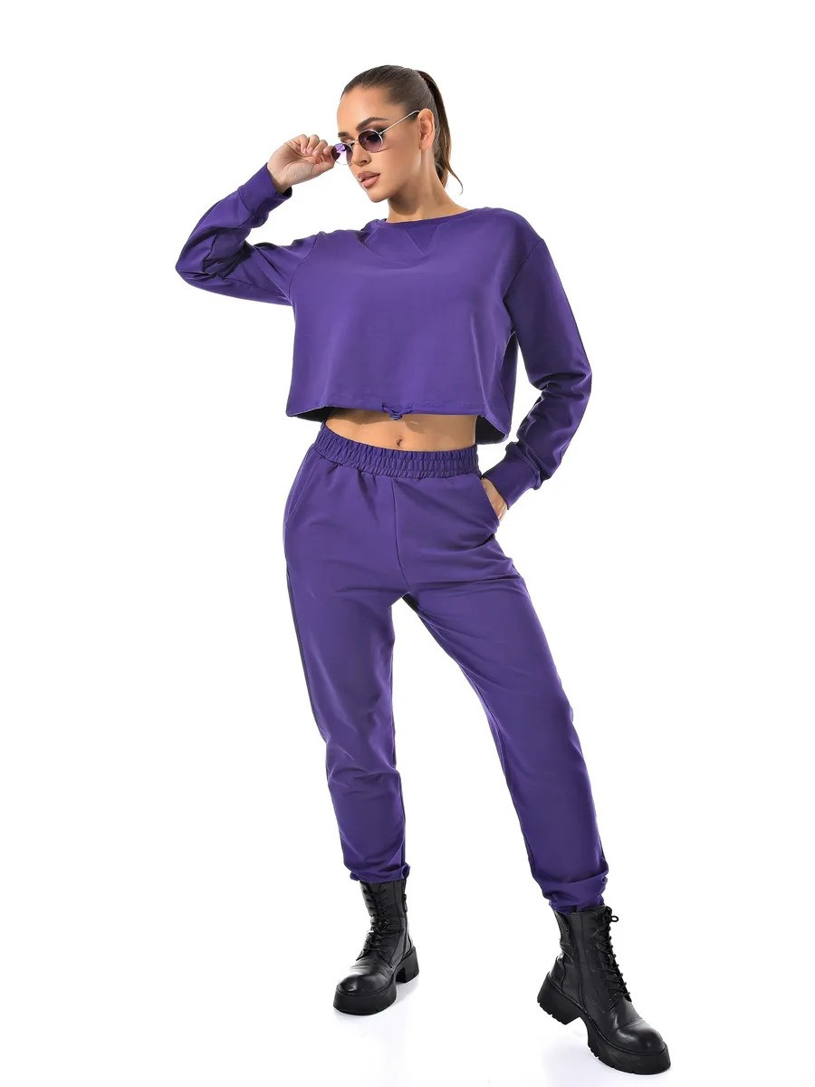 Укороченный свитшот и джоггеры с высокой посадкой созданы из качественного хлопка с добавлением лайкры для эластичности.