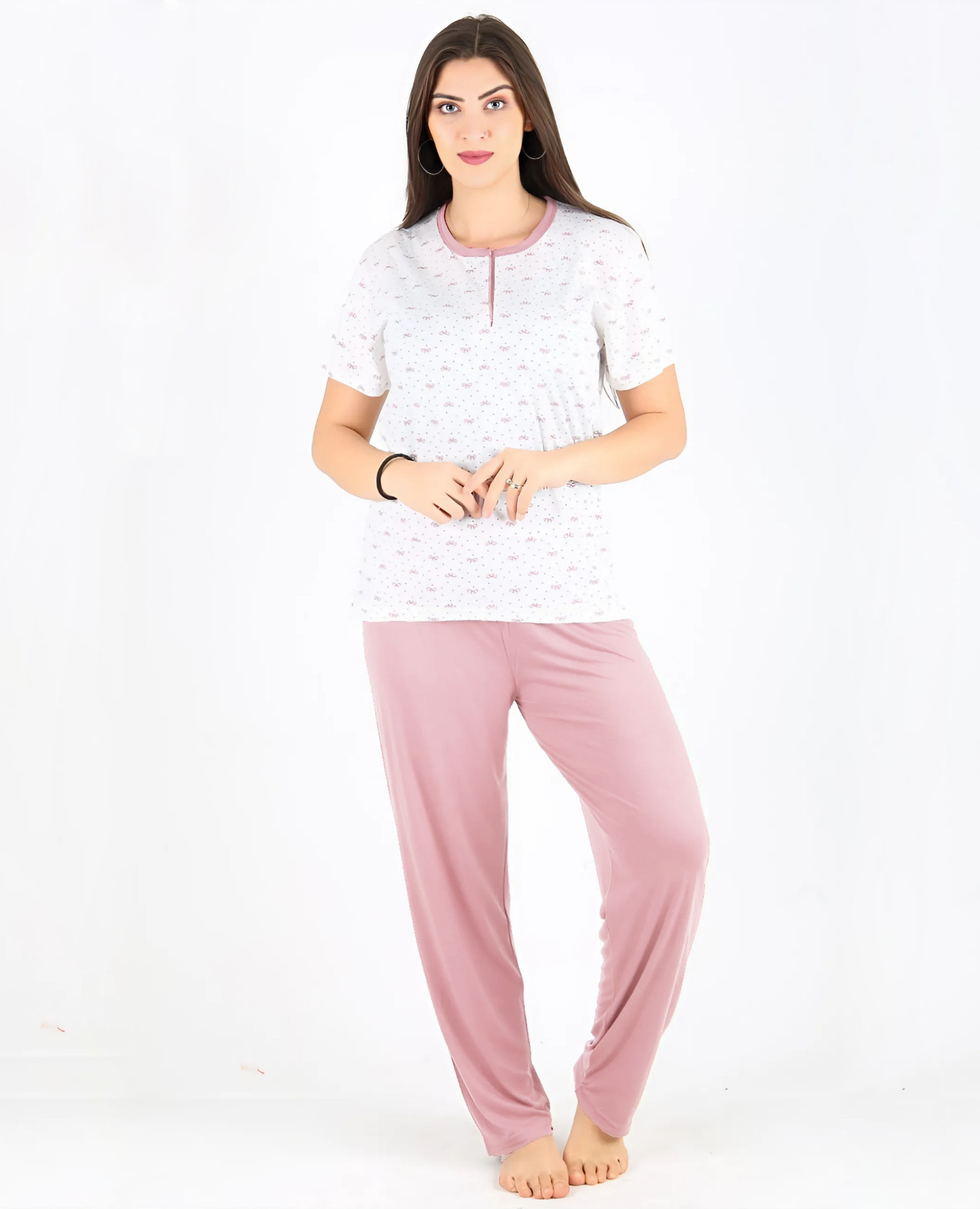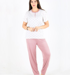 Женский клаасическая пижама, состоящий из футболки на пуговках и широких штанин на резинке.