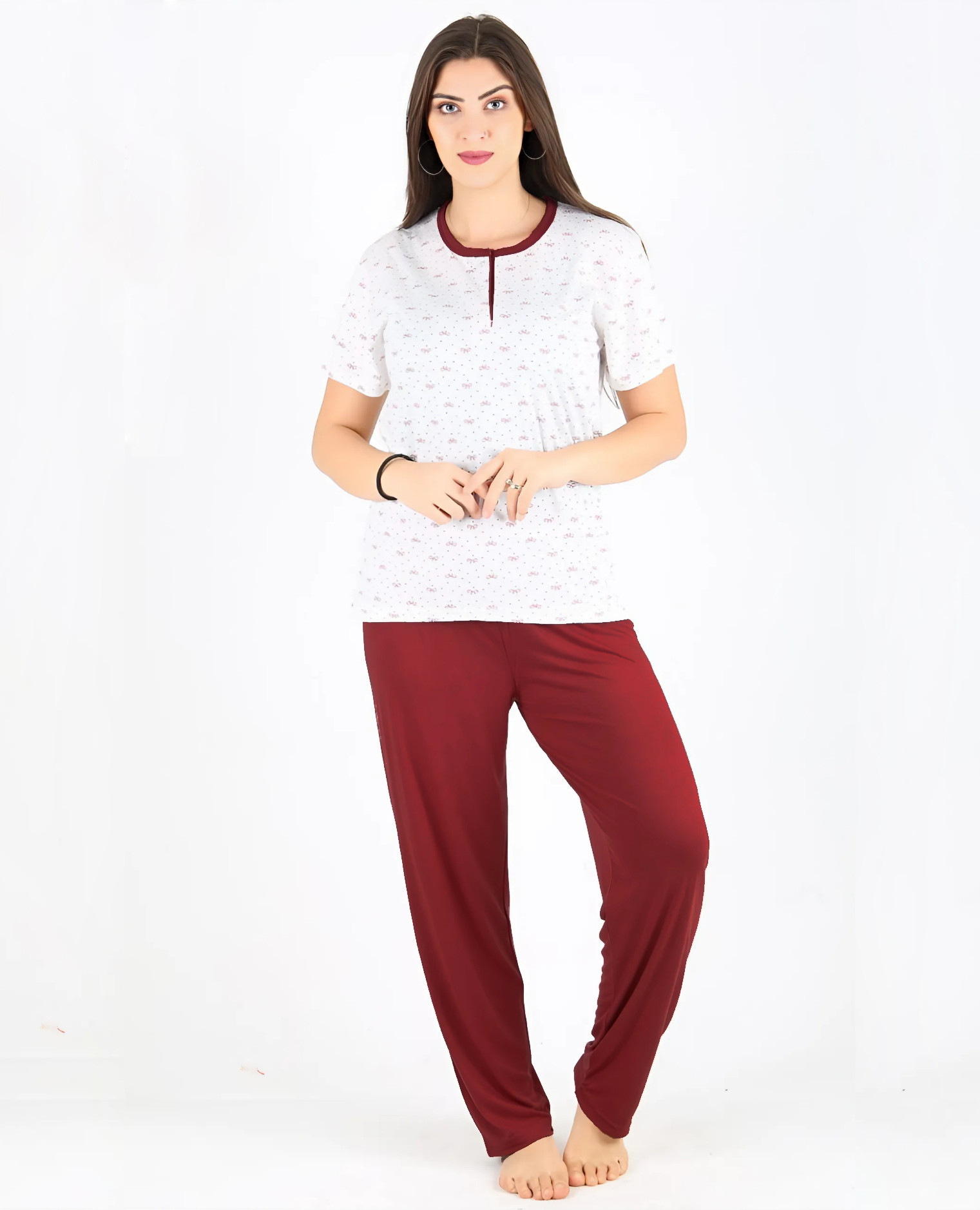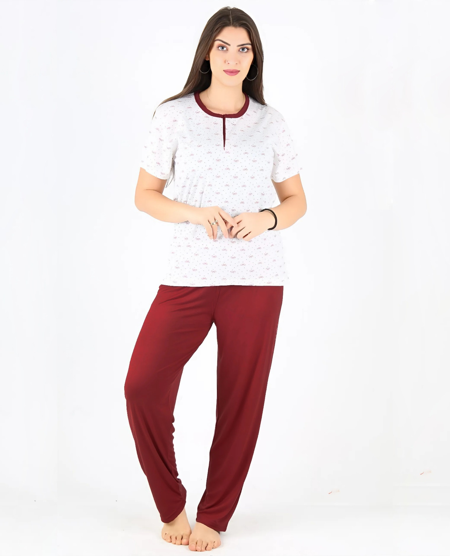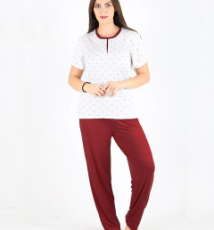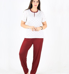 Женский клаасическая пижама, состоящий из футболки на пуговках и широких штанин на резинке.