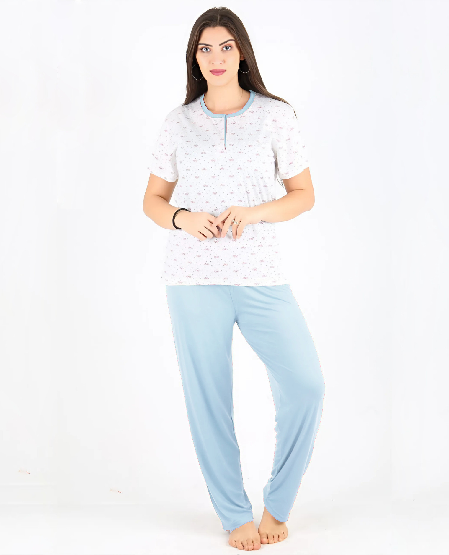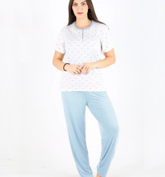 Женский клаасическая пижама, состоящий из футболки на пуговках и широких штанин на резинке.