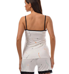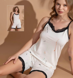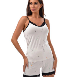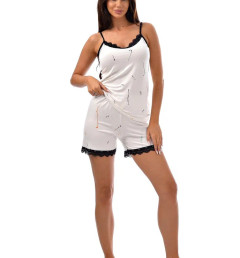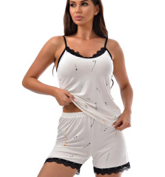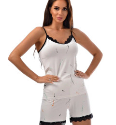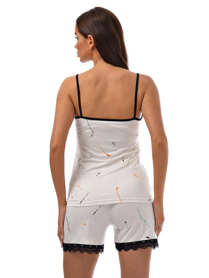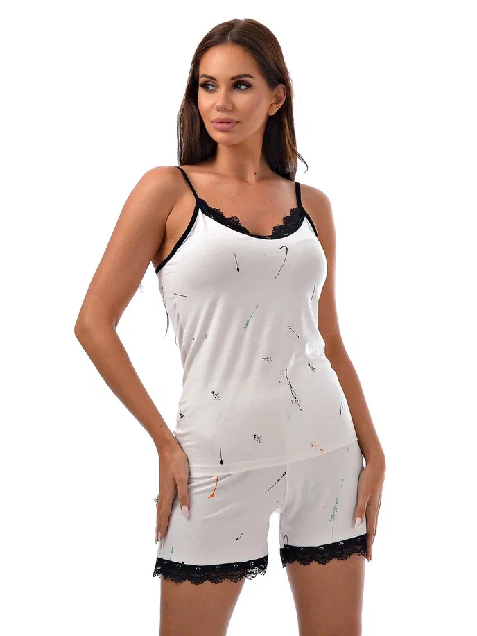 Комплект состоит из майки на тонких бретельках и шортиков. Украшен кружевом.