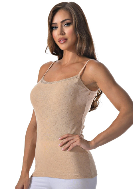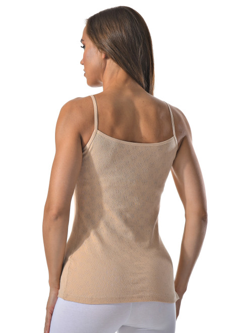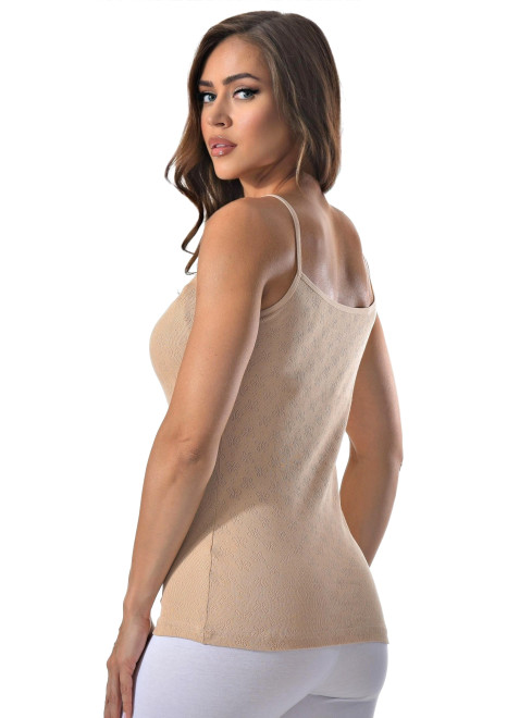 Комплект состоит из майки на тонких бретельках и шортиков. Украшен кружевом.