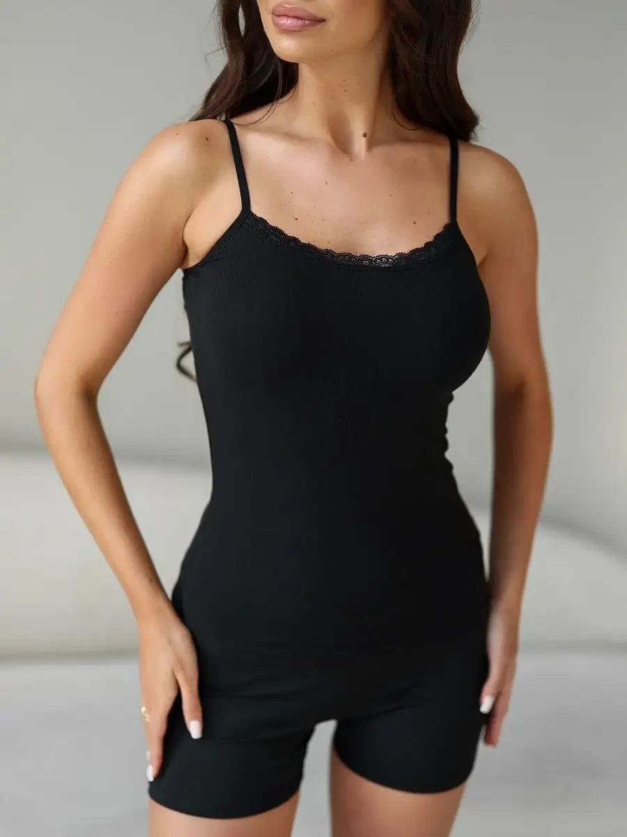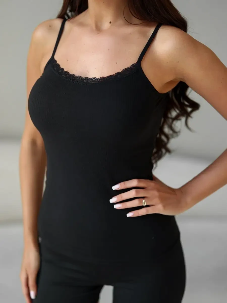 Женская майка Berrak черного цвета на тонких лямках с классической спиной. Есть кружево по краю горловины. Приталенная. Ткань в рубчик. Майка изготовлена из 92% вискозы и 8% эластана.