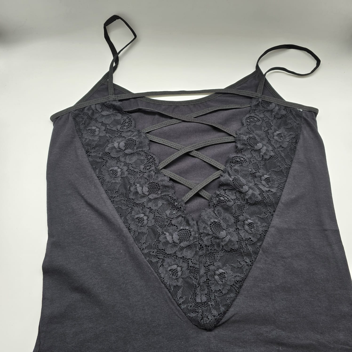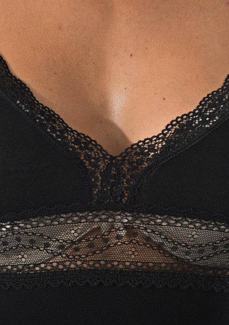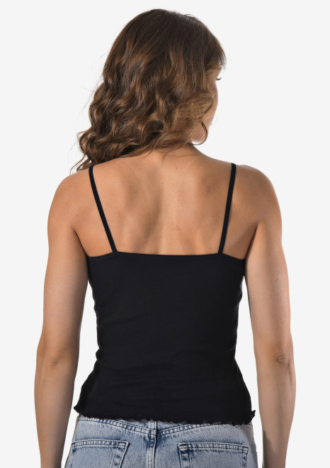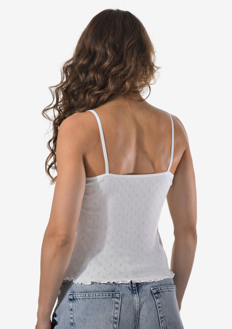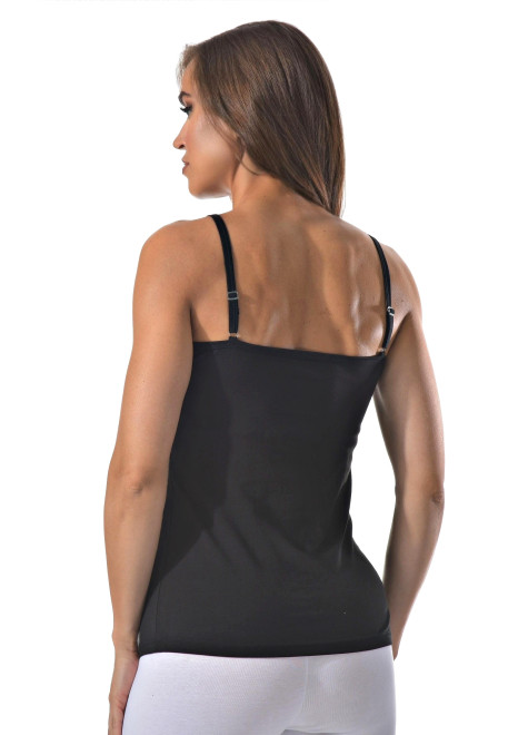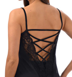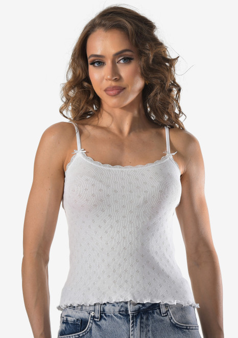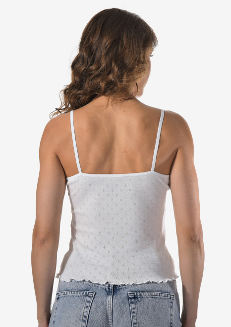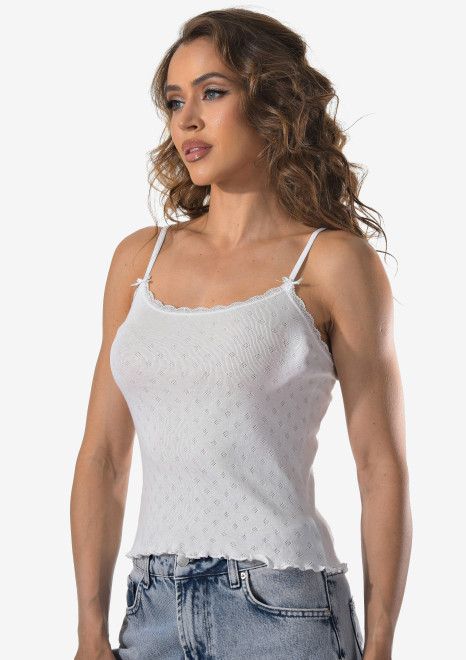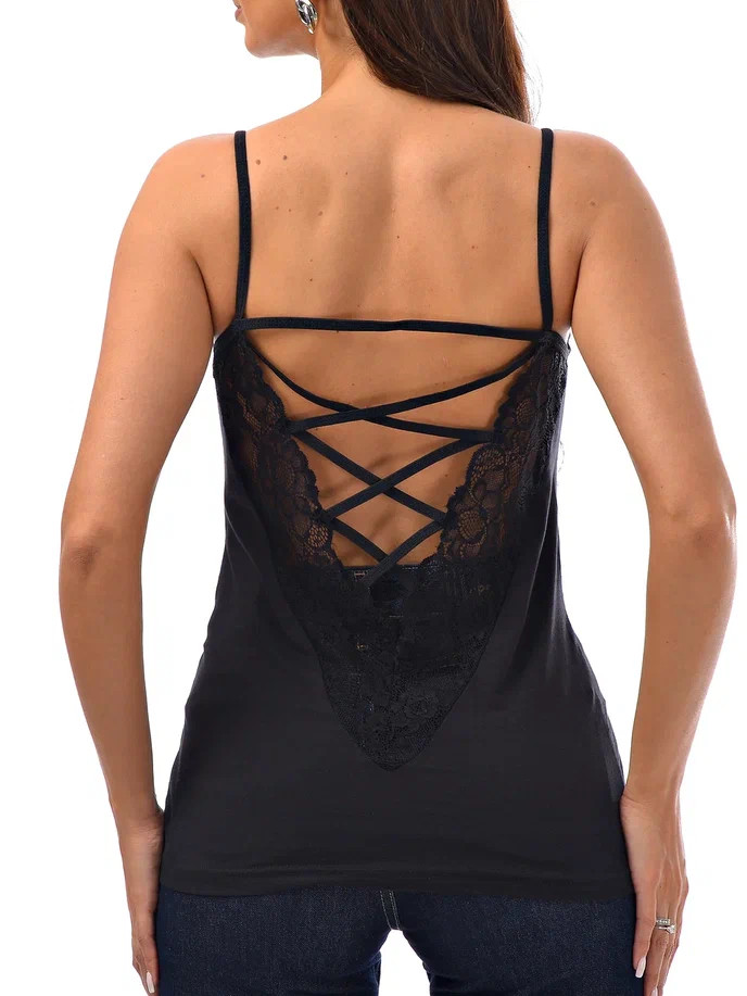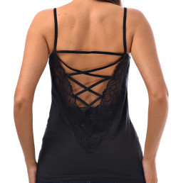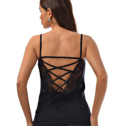 Женская майка на тонких бретельках с ажурной вставкой на спине.