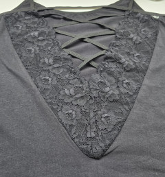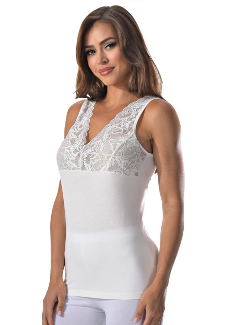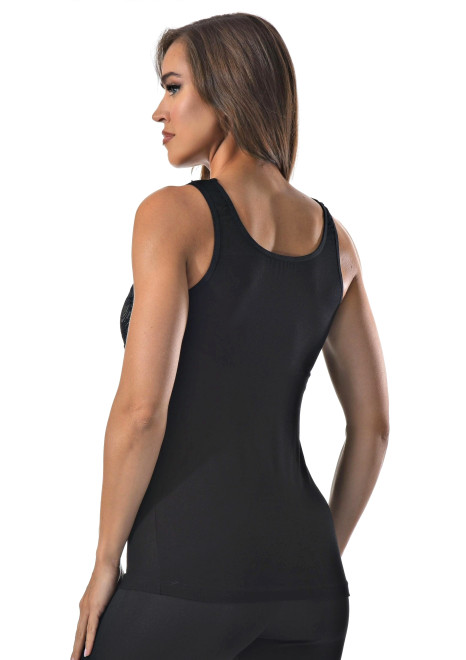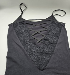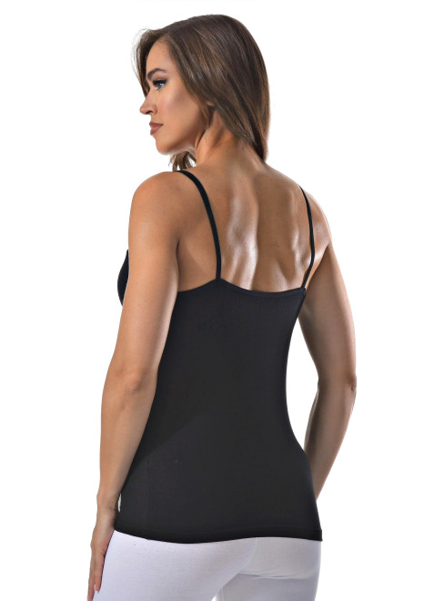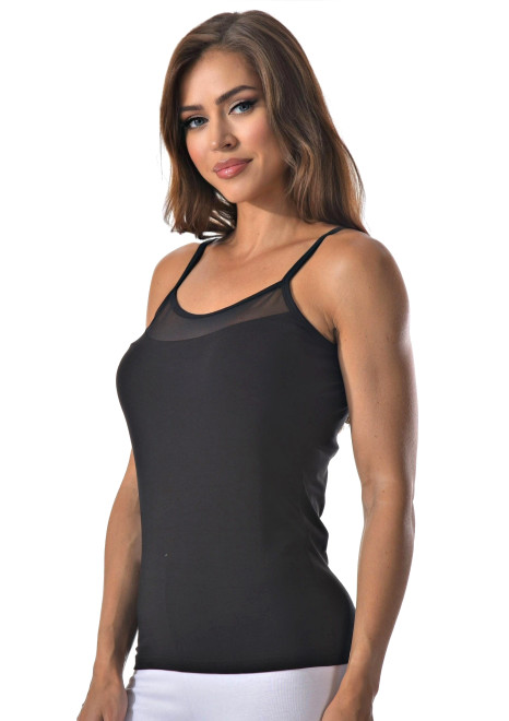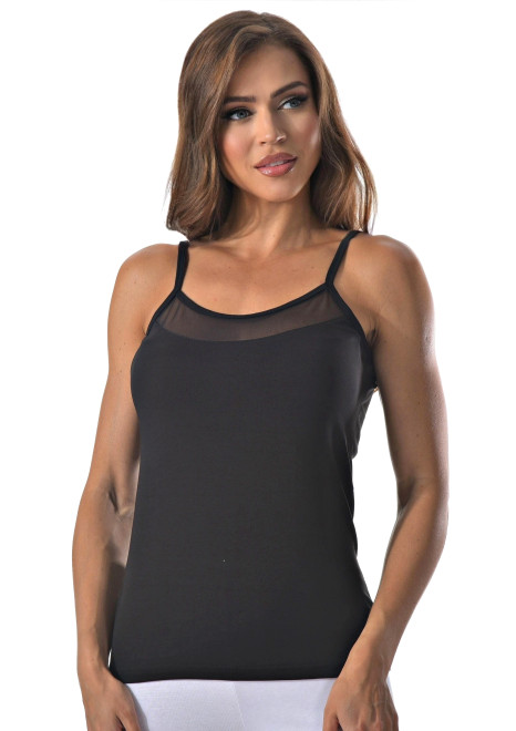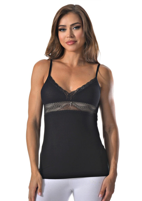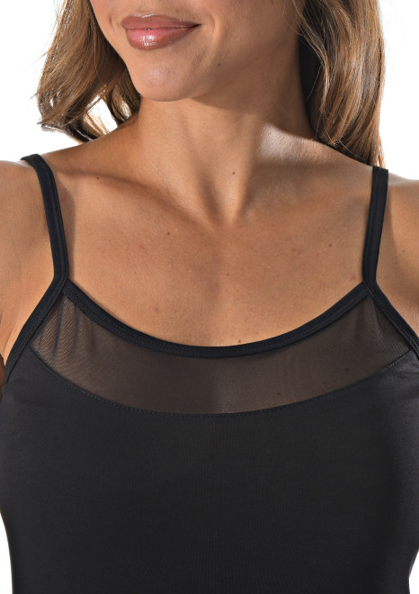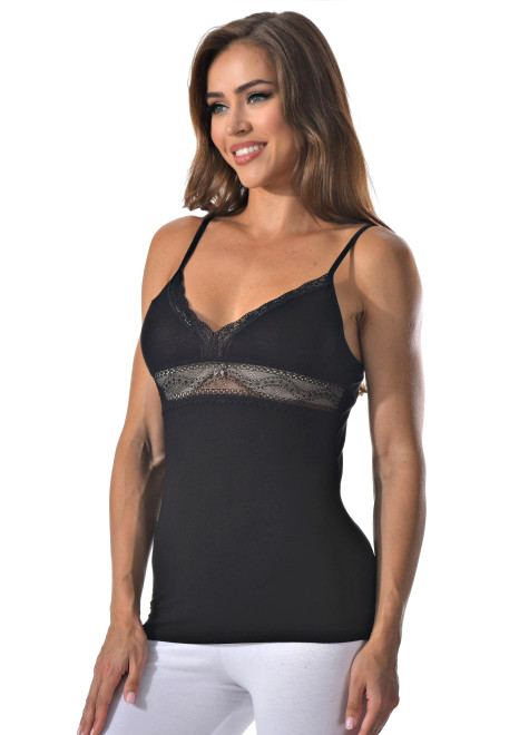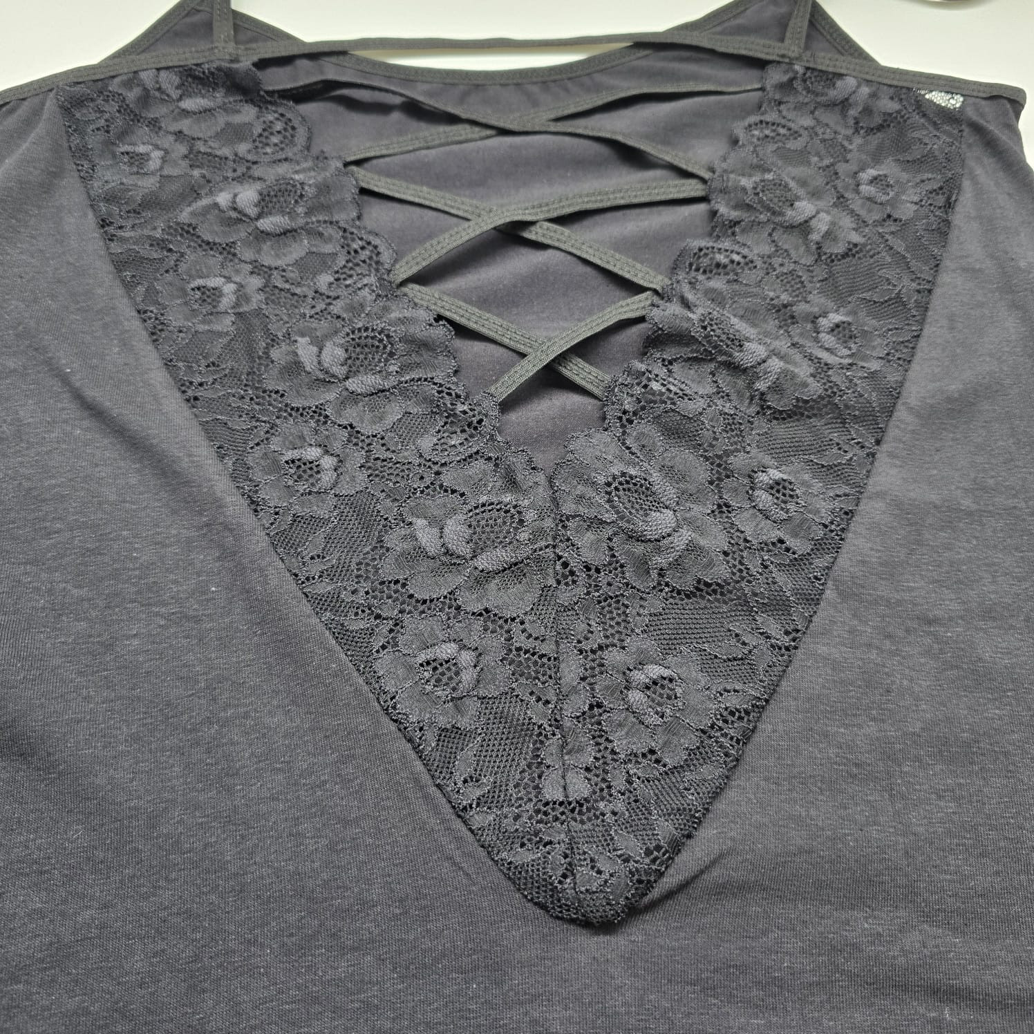 Женская майка на тонких бретельках с ажурной вставкой на спине.