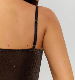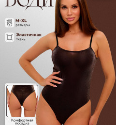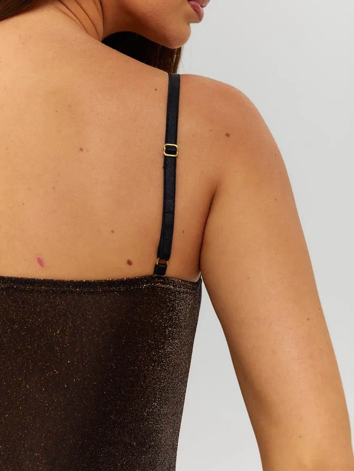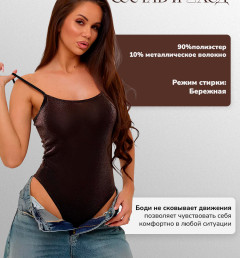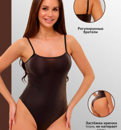 Боди просвечивается. Цвет коричневый с отливом бронзы, регулируемые бретели. Застежка на крючках.