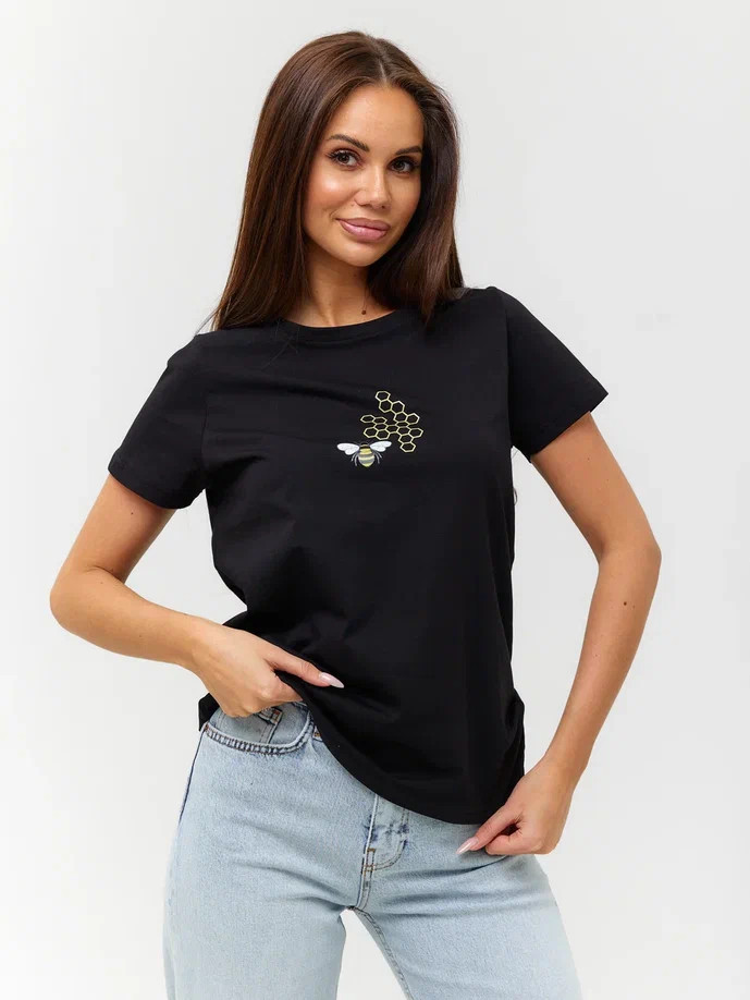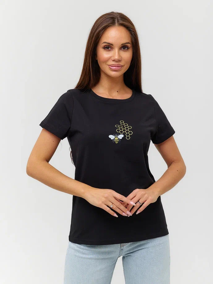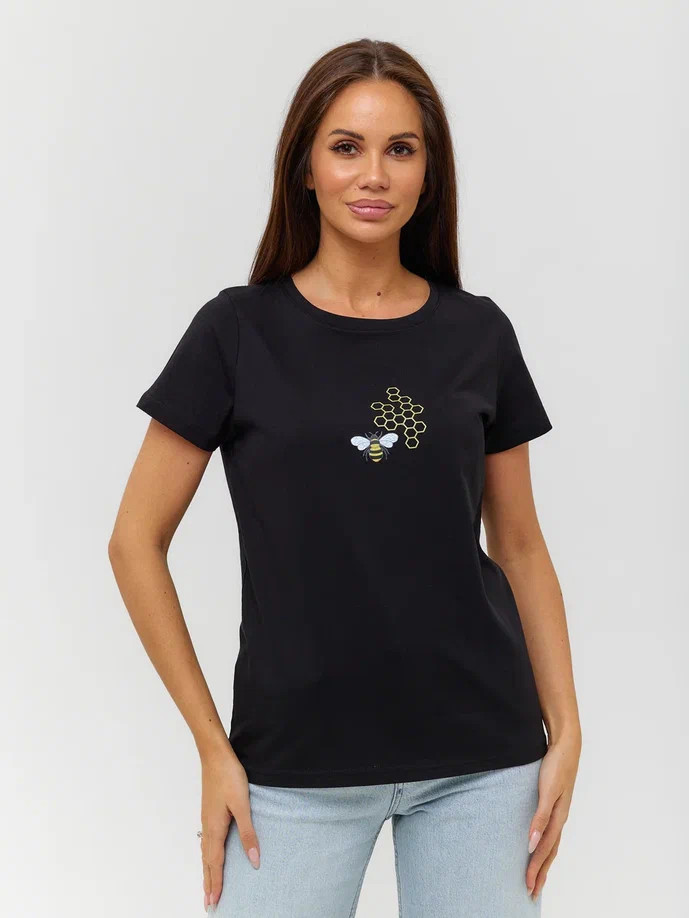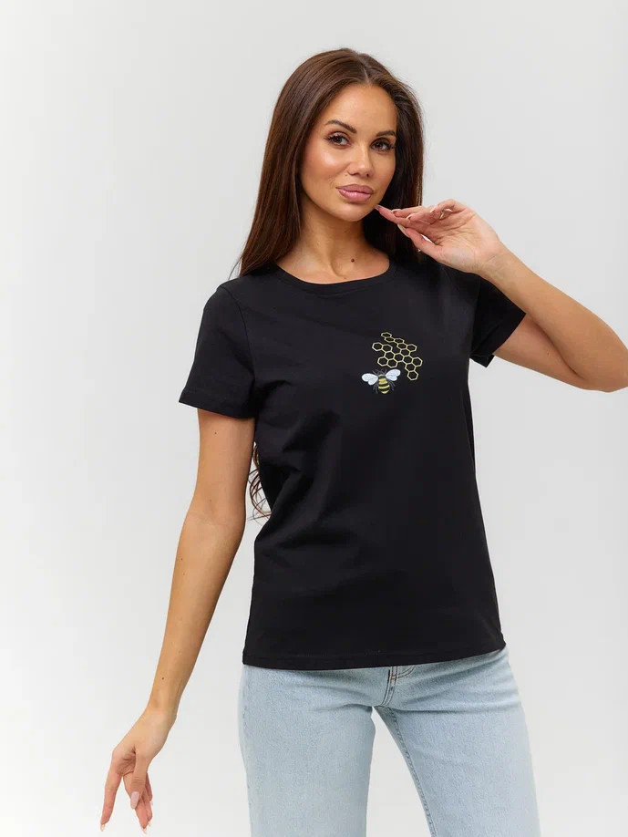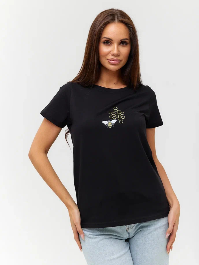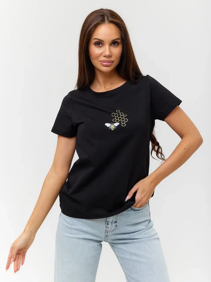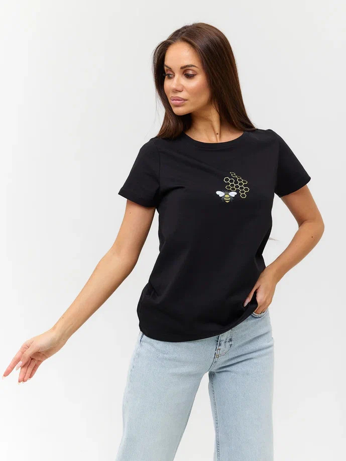 Футболка классического фасона Berrak черного цвета прямого кроя, с коротким рукавом и округлым вырезом. Свободная посадка. С принтом. Рукав втачной с манжетом. Футболка сшита из 100 % хлопкового полотна.