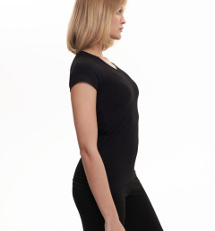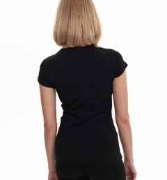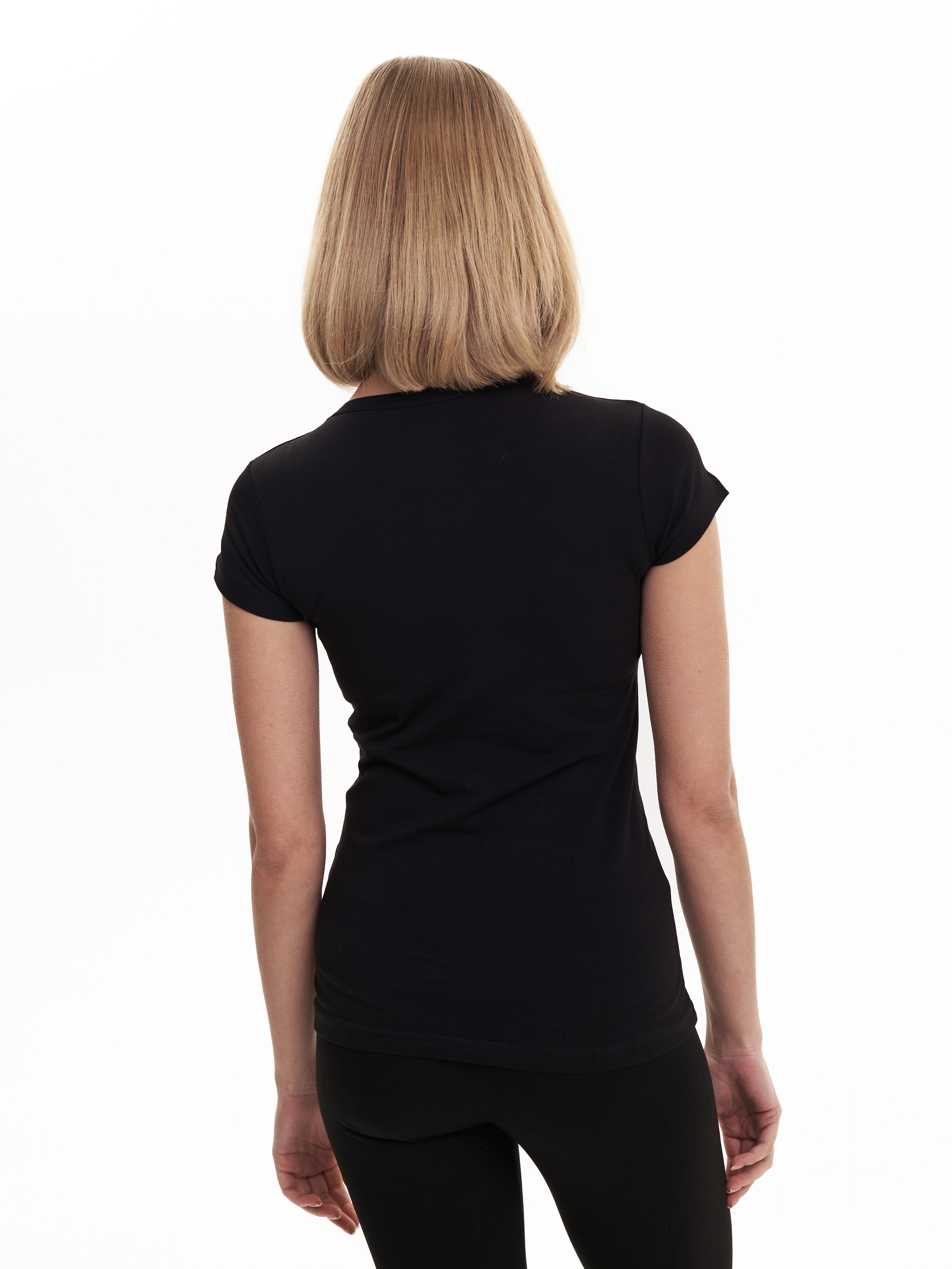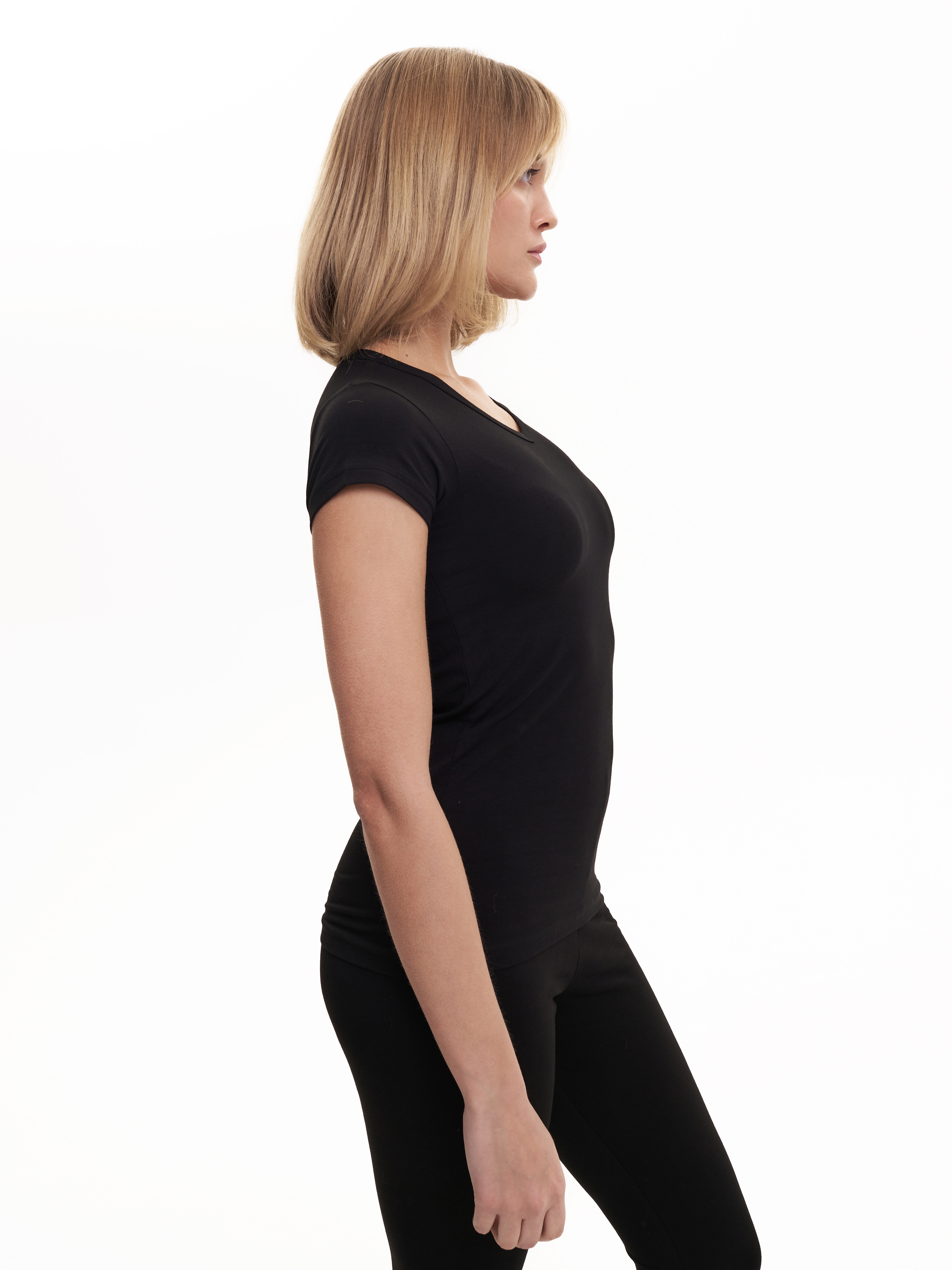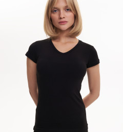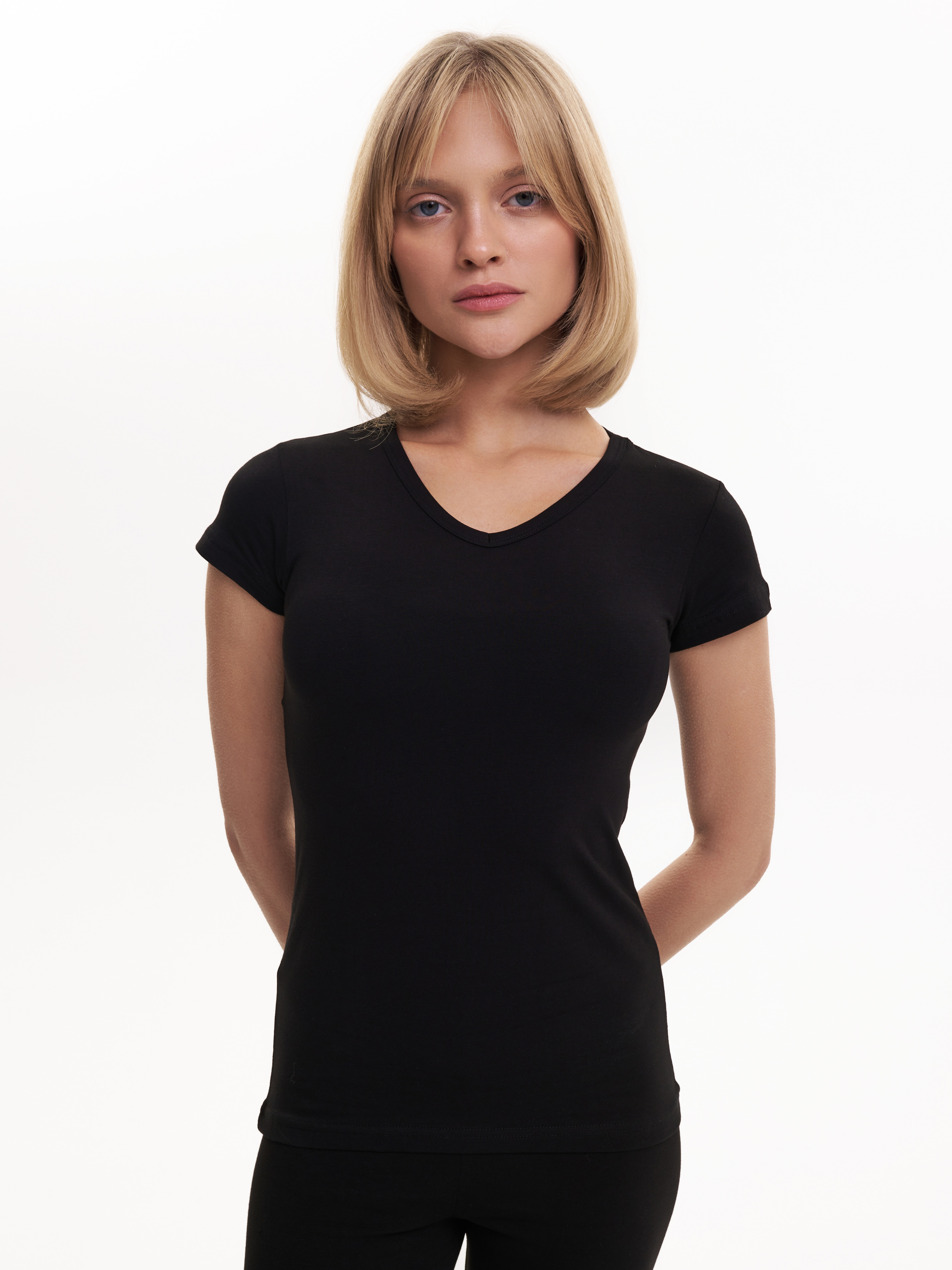 Базовая футболка Berrak черного цвета с V-образной горловиной, с коротким рукавом. Приталенная. Однотонная. Рукав втачной с манжетом.