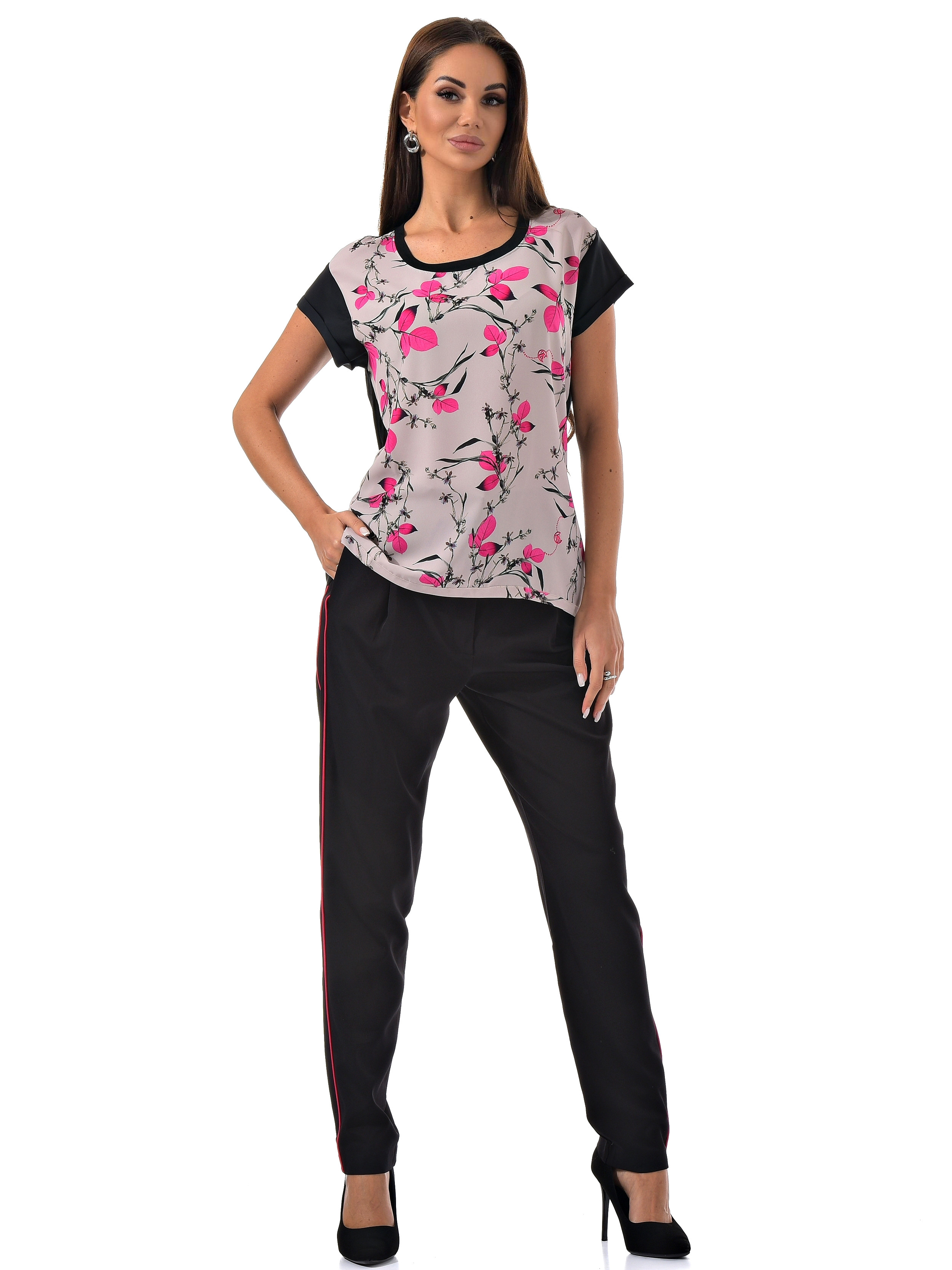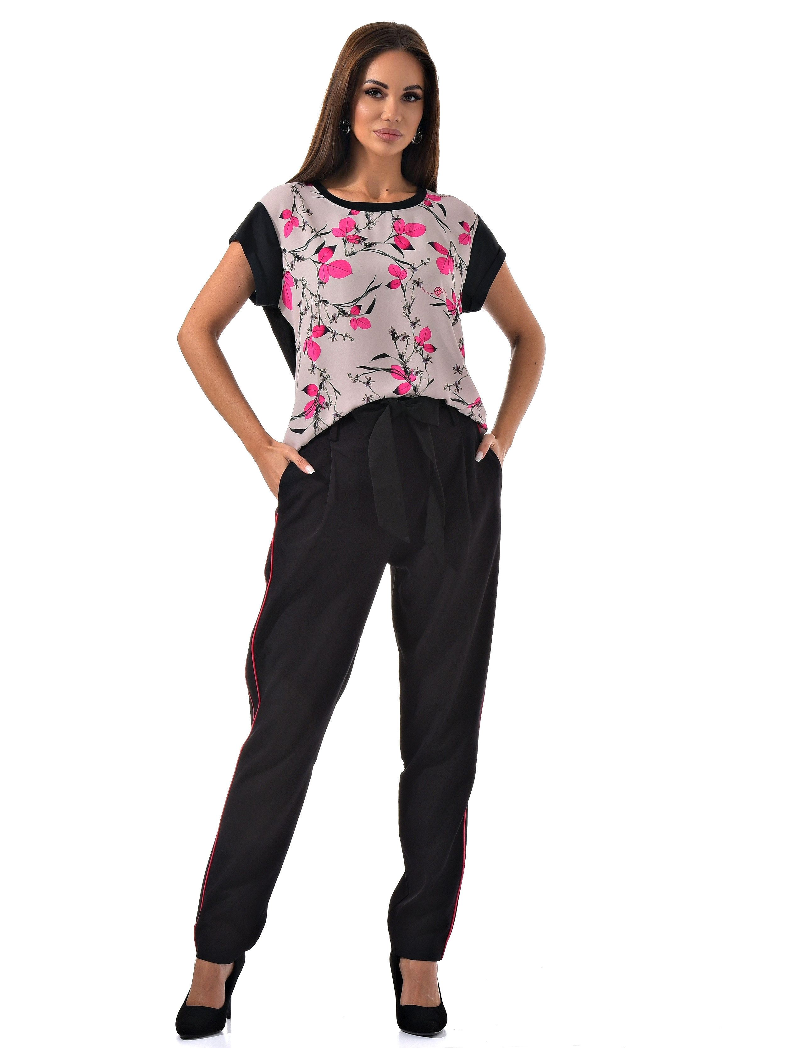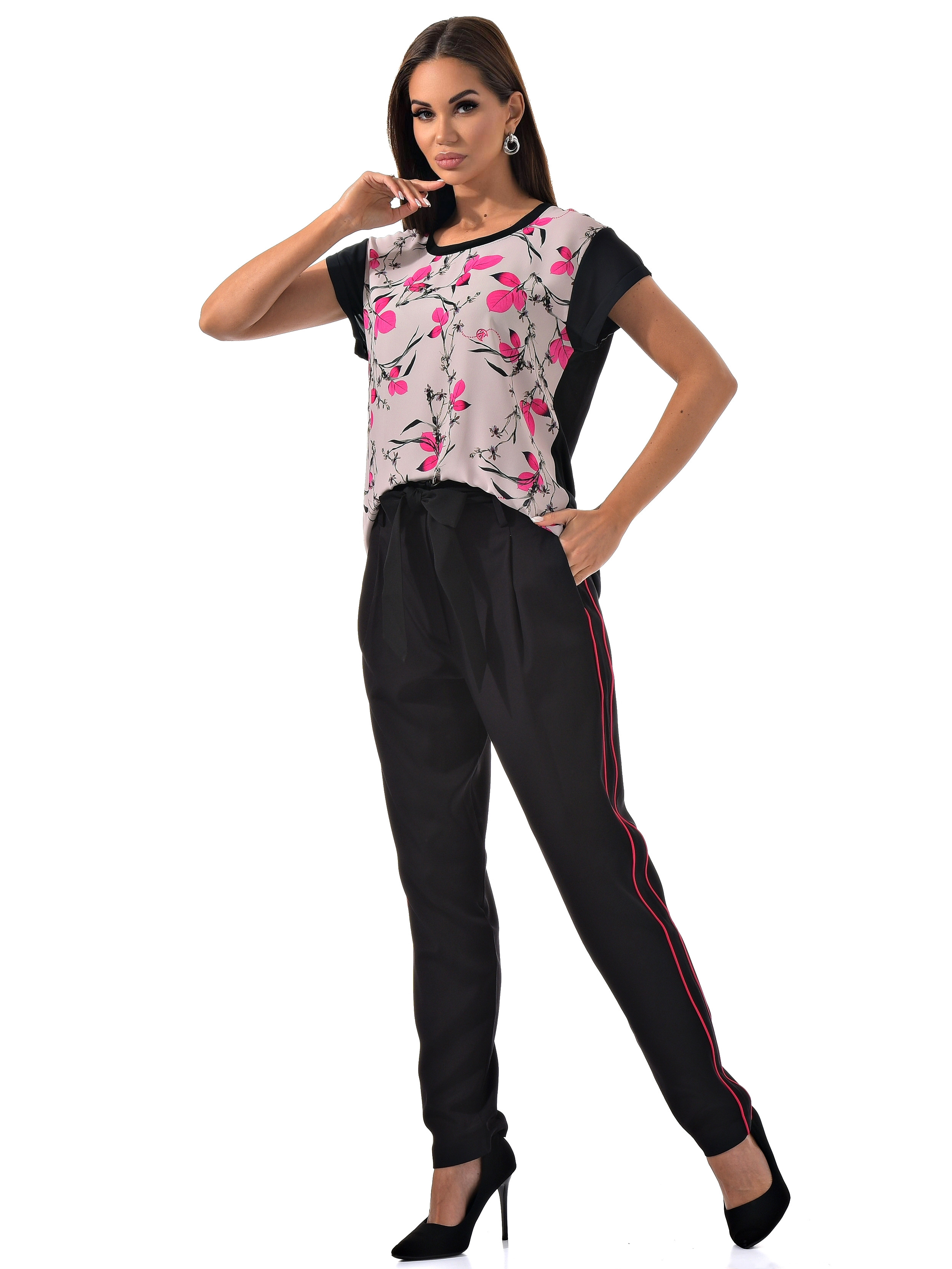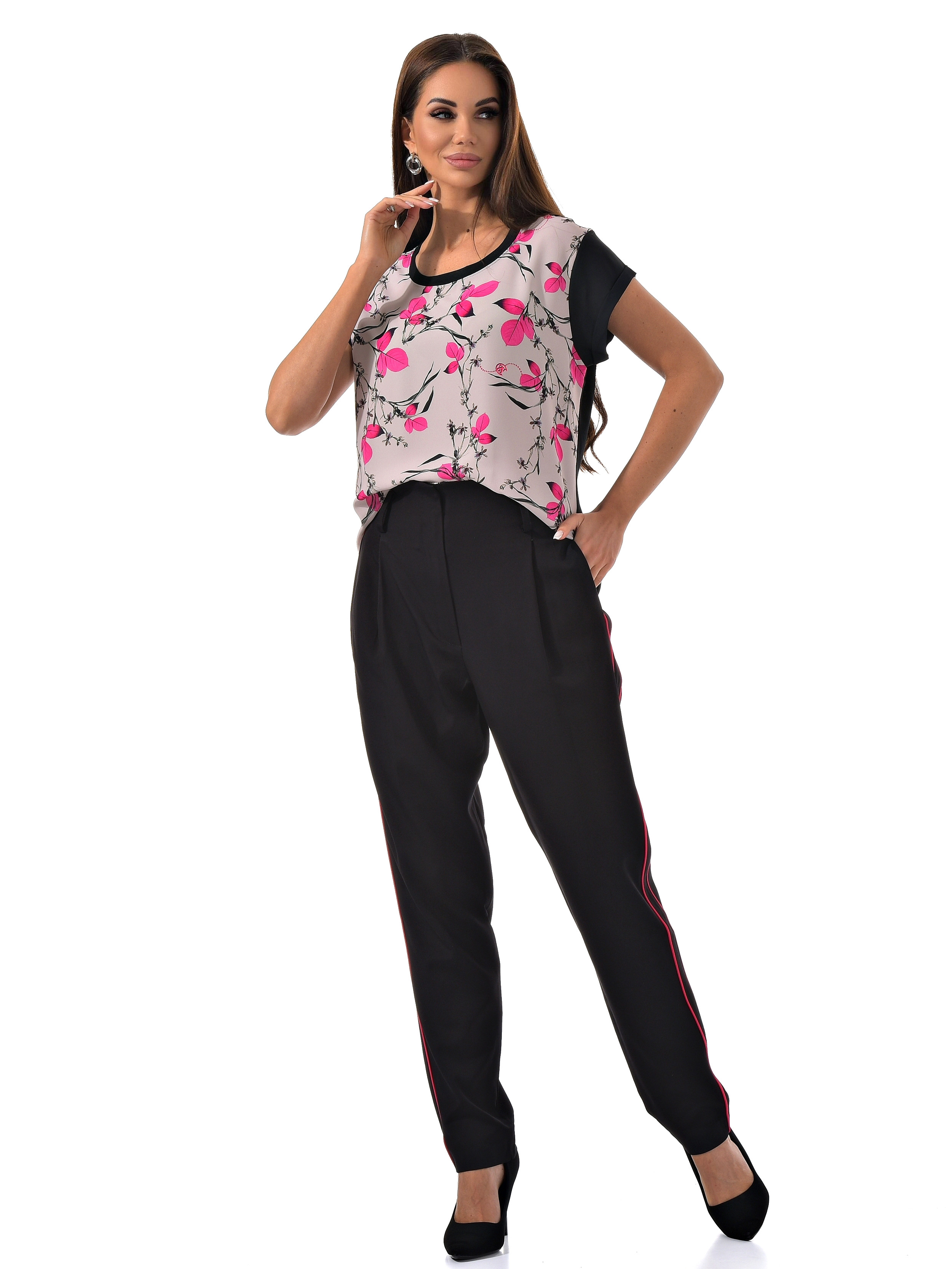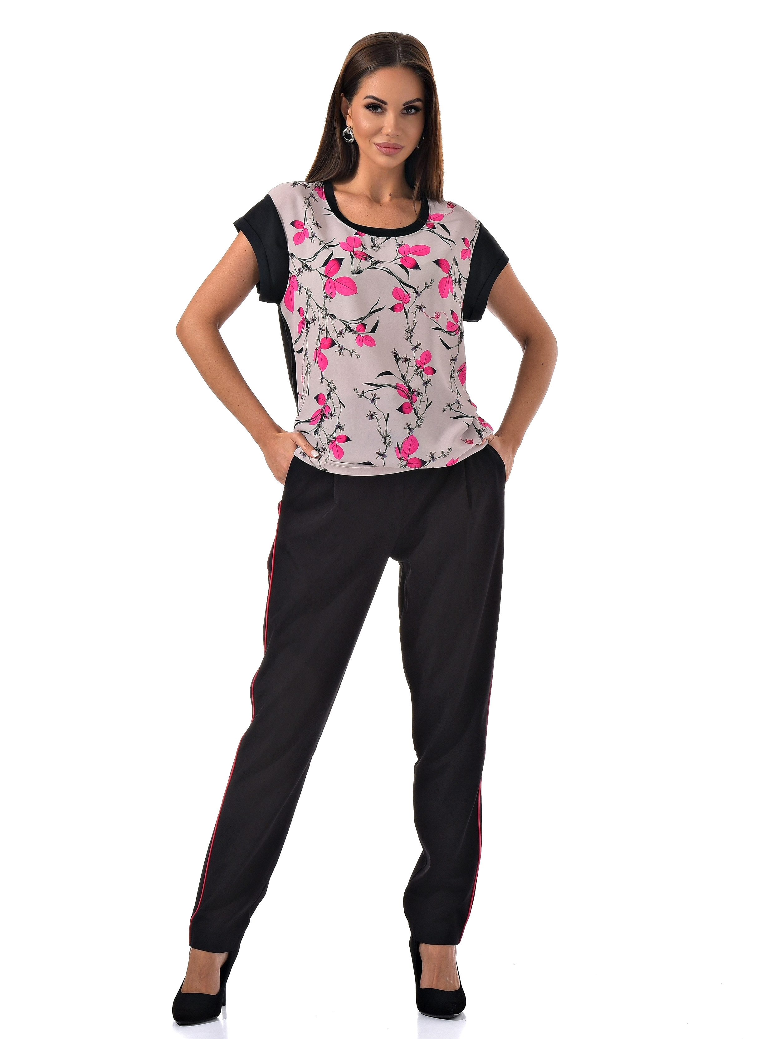 С радостью представляем вам стильный костюм-двойку, который станет вашим незаменимым спутником. Он включает в себя черные брюки с розовыми полосками по бокам и блузку с короткими рукавами, украшенную цветочным принтом с розовыми листочками. Благодаря особому составу материала, этот костюм не только выглядит эффектно, но и дарит ощущение комфорта и легкости в носке.