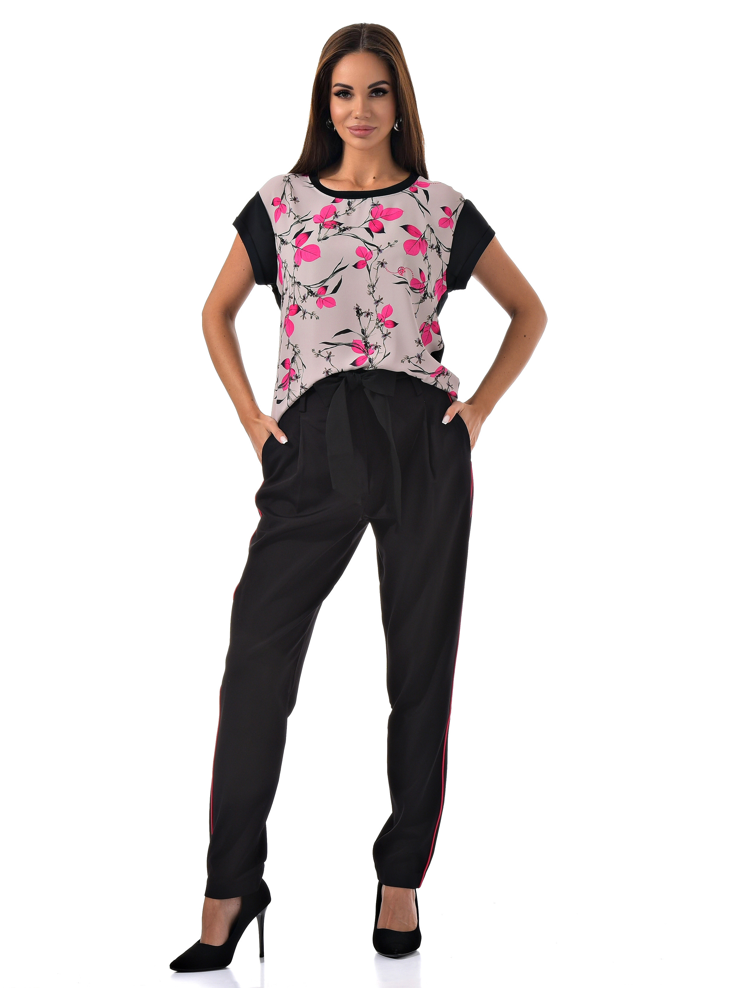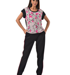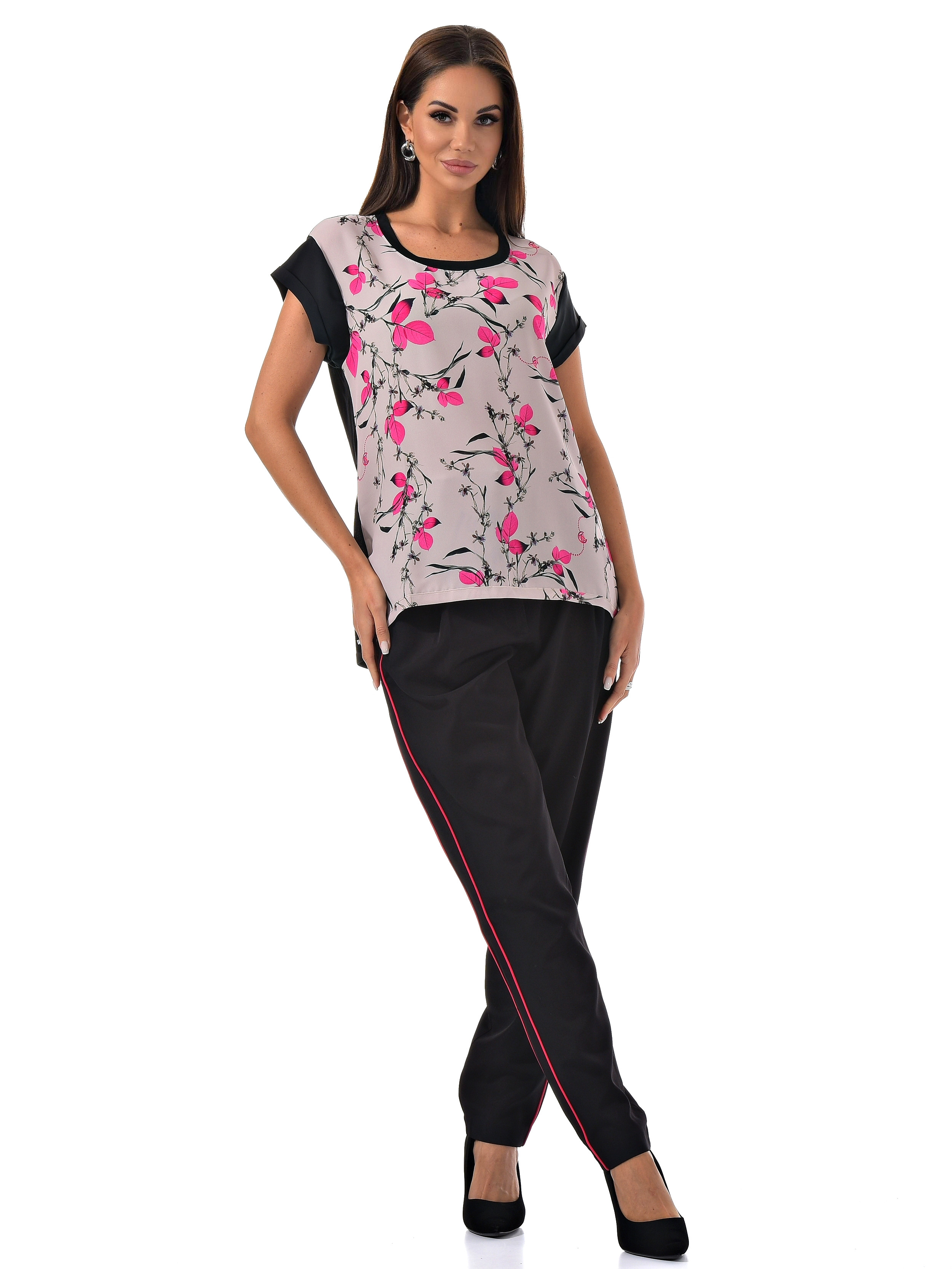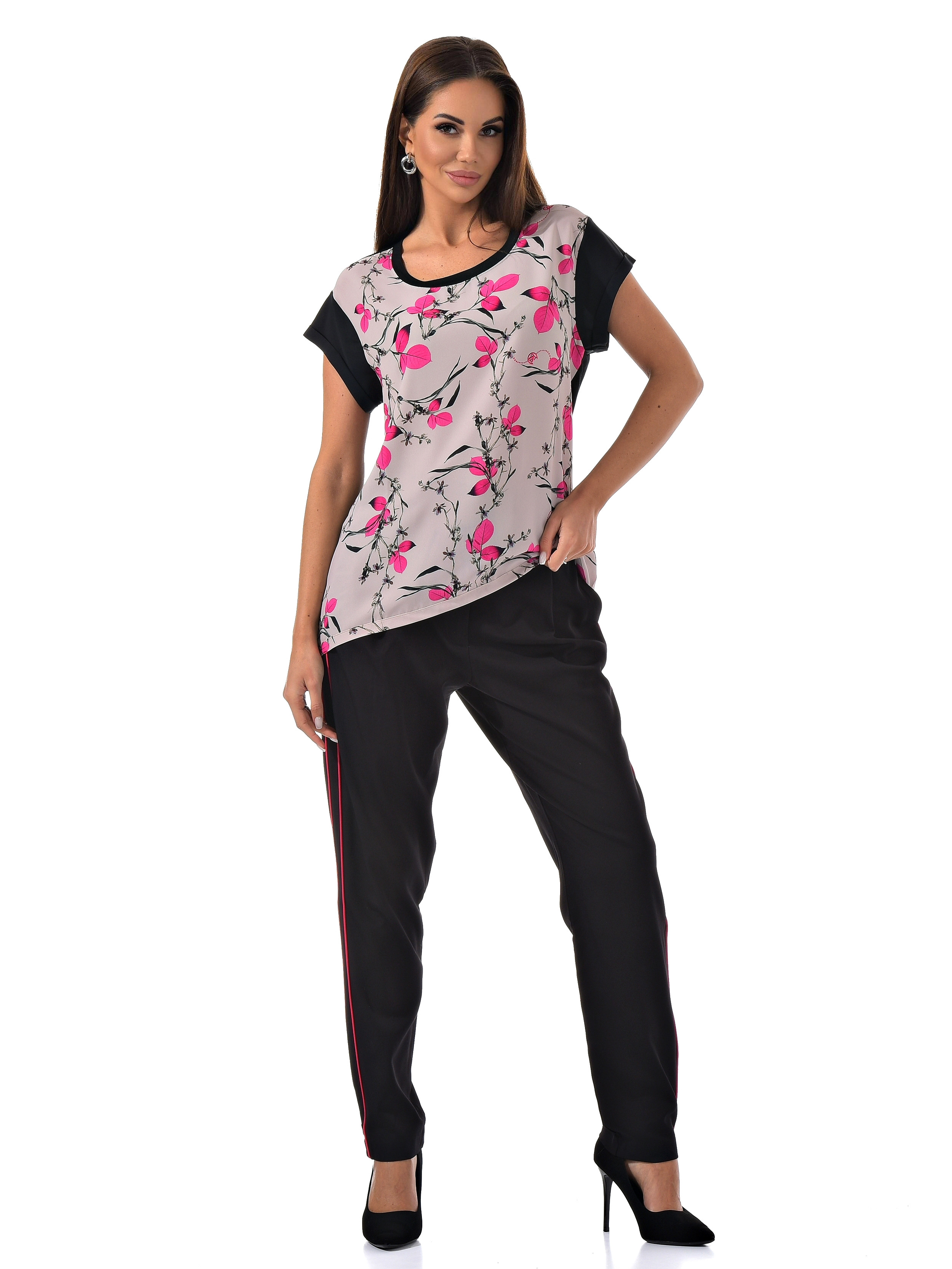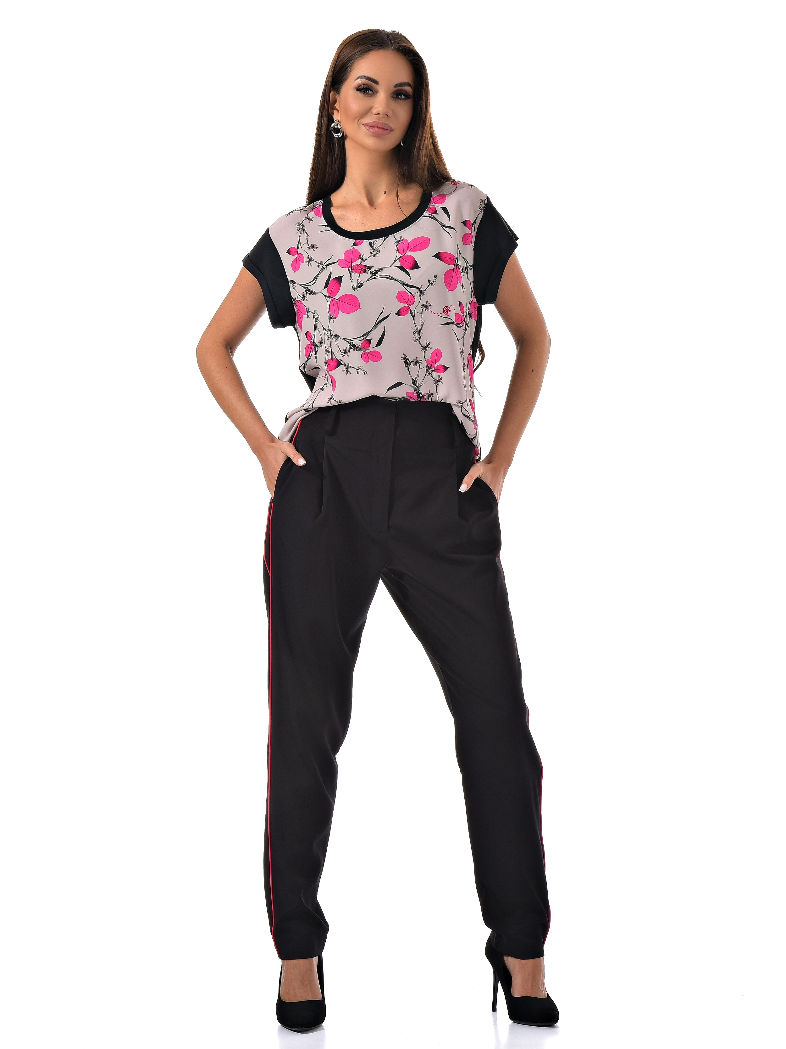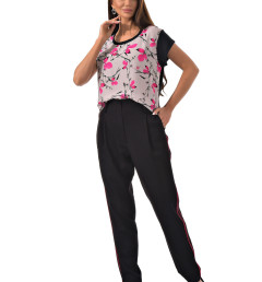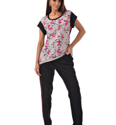 С радостью представляем вам стильный костюм-двойку, который станет вашим незаменимым спутником. Он включает в себя черные брюки с розовыми полосками по бокам и блузку с короткими рукавами, украшенную цветочным принтом с розовыми листочками. Благодаря особому составу материала, этот костюм не только выглядит эффектно, но и дарит ощущение комфорта и легкости в носке.