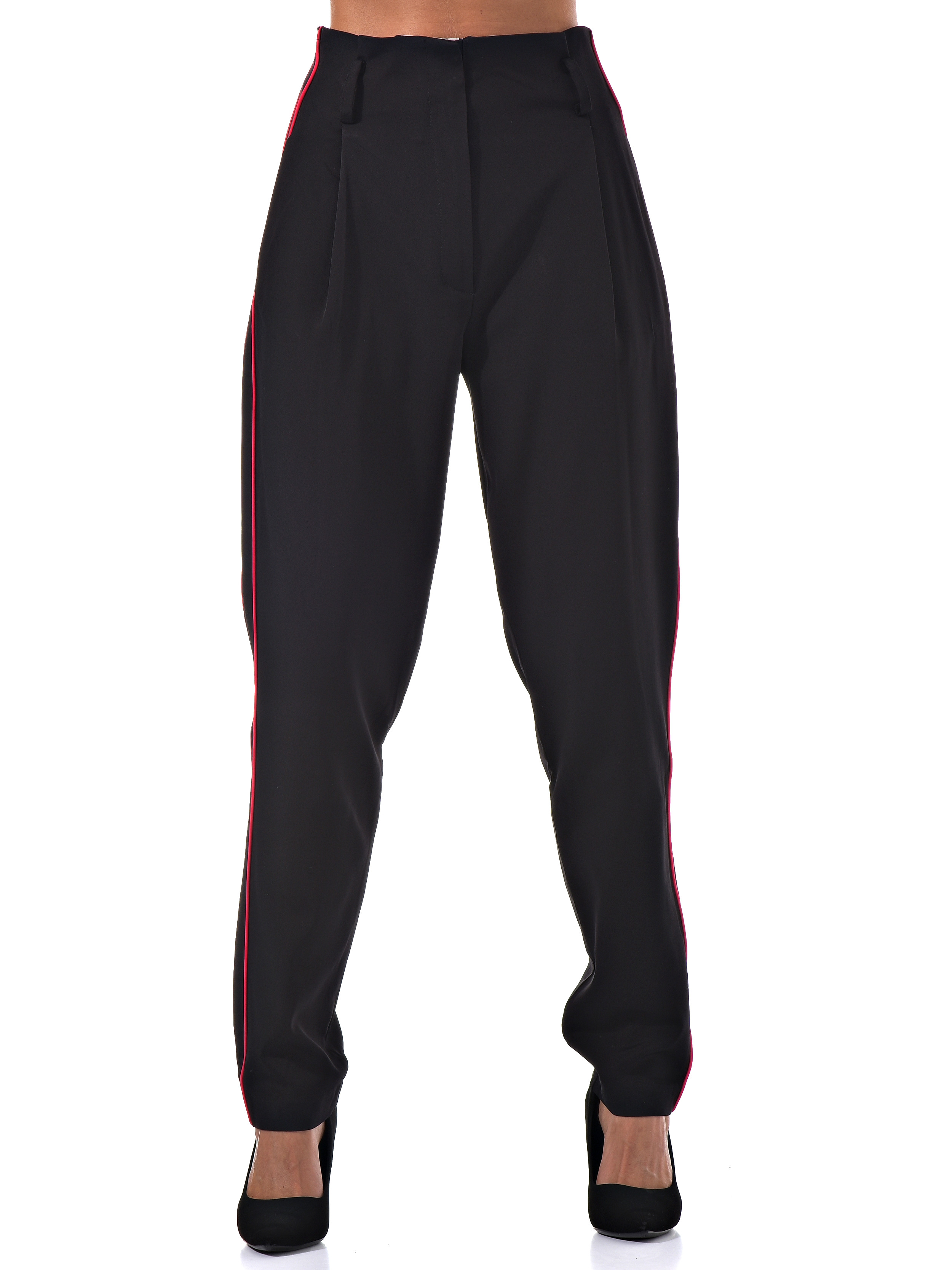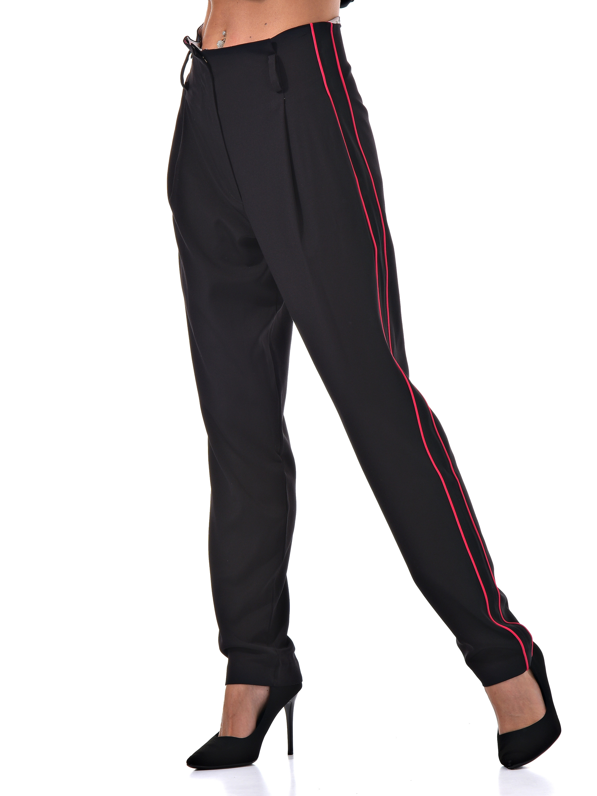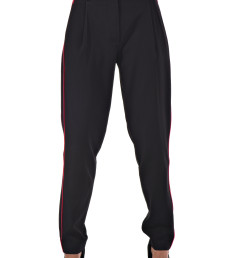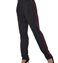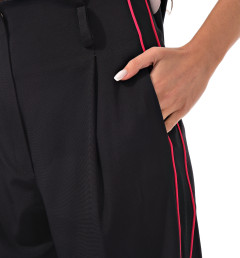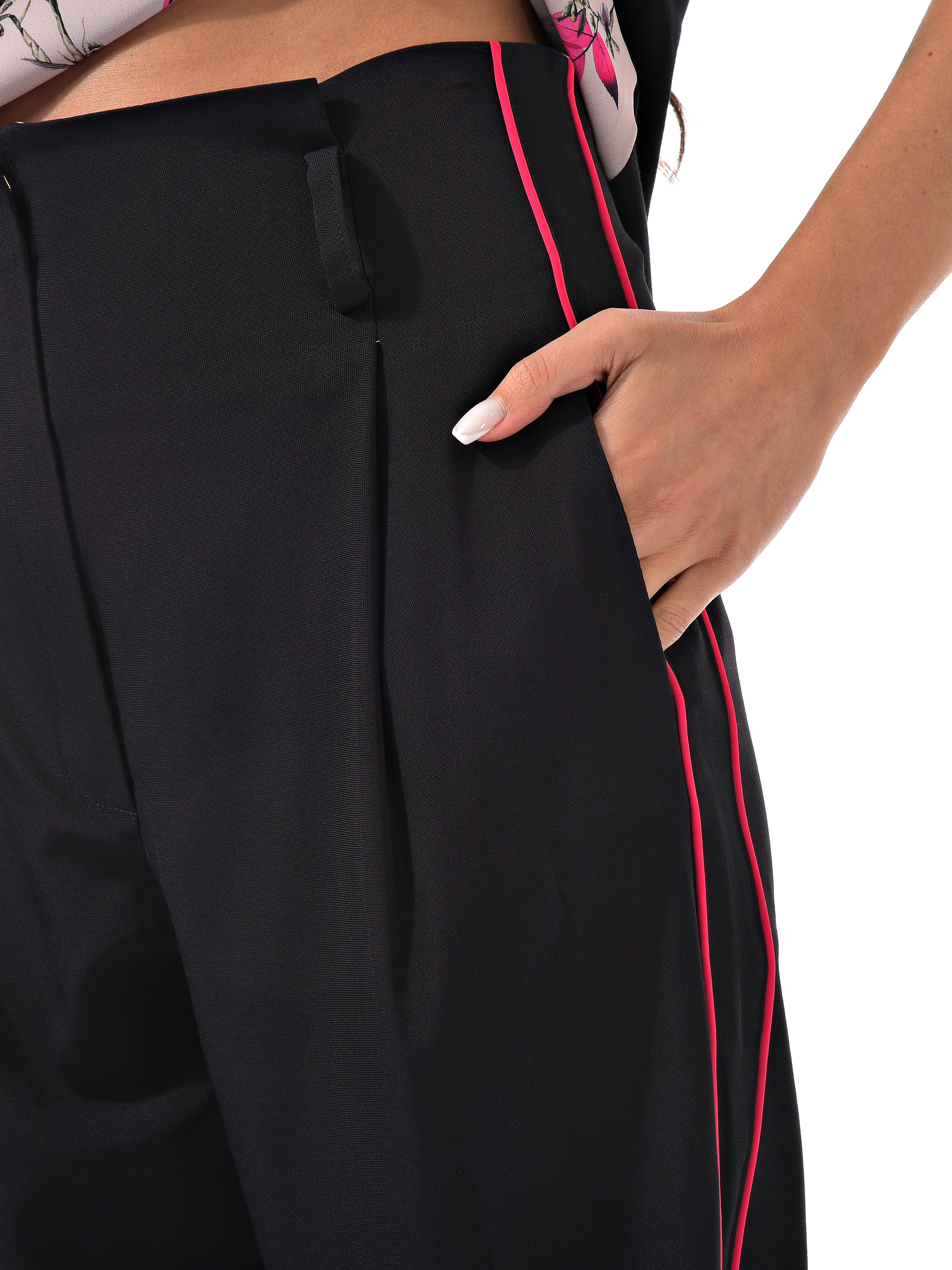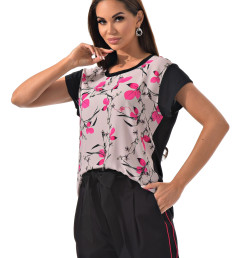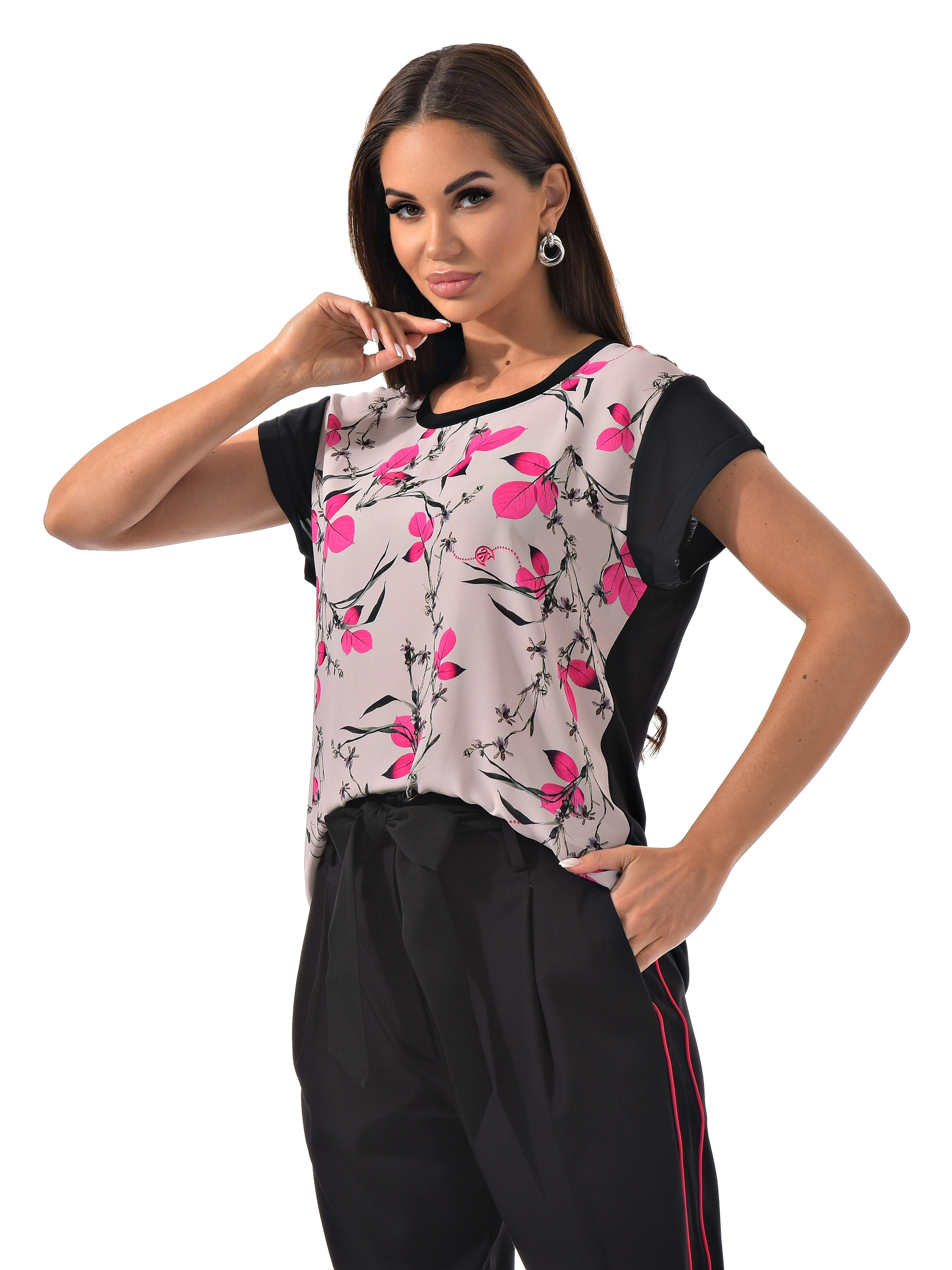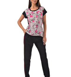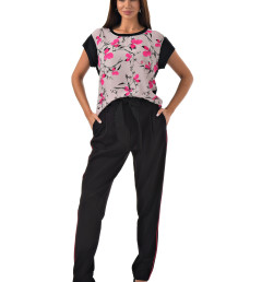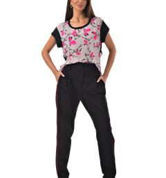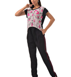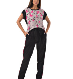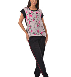 С радостью представляем вам стильный костюм-двойку, который станет вашим незаменимым спутником. Он включает в себя черные брюки с розовыми полосками по бокам и блузку с короткими рукавами, украшенную цветочным принтом с розовыми листочками. Благодаря особому составу материала, этот костюм не только выглядит эффектно, но и дарит ощущение комфорта и легкости в носке.