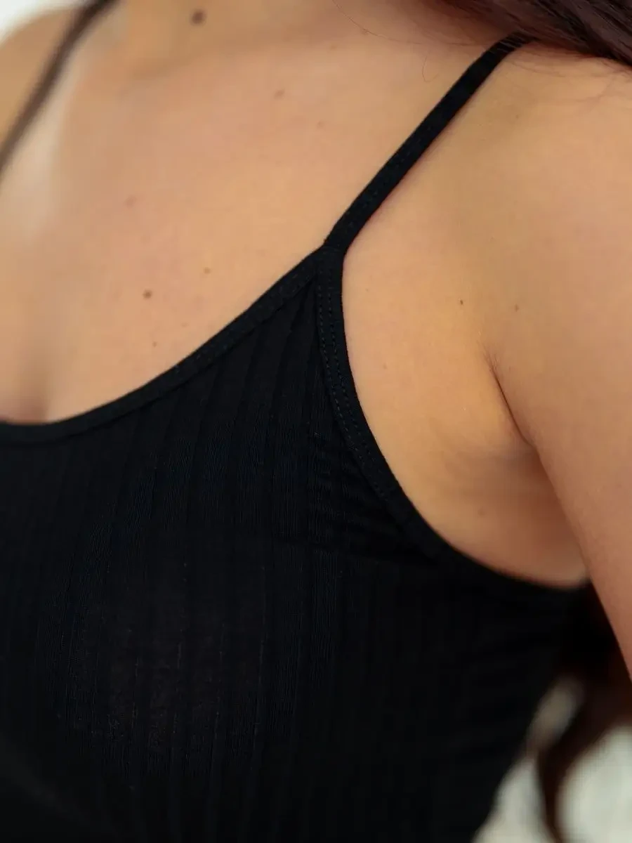 Кроп топ Berrak черного цвета на тонких регулируемых бретелях, ткань в рубчик. Состав из 92% вискозы и 8% эластана обеспечивает легкость и удобство.