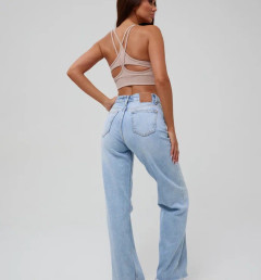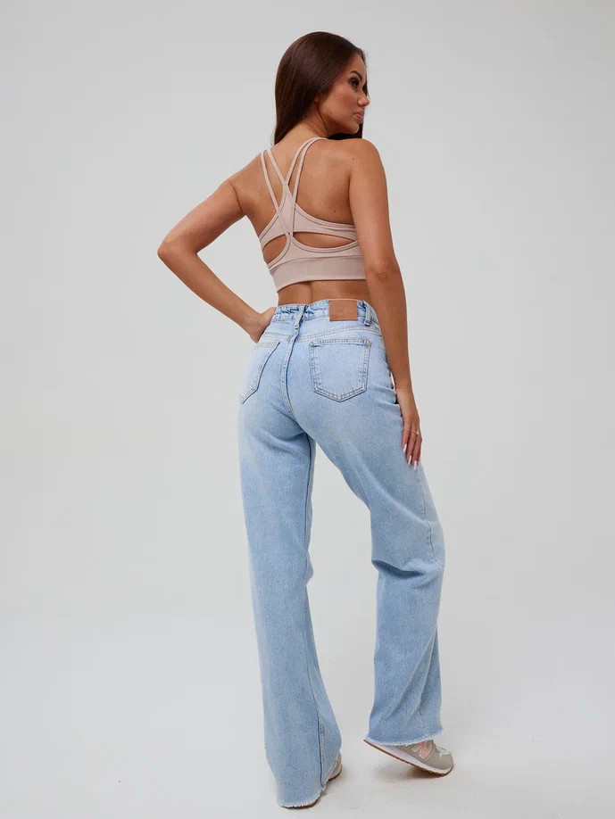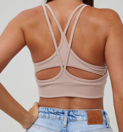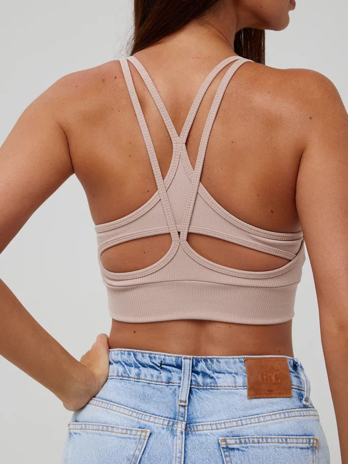 Спортивный топ Kota бежевого цвета на тонких бретелях, которые пересекаются в виде геометрического узора. С пушап вставками, ткань в рубчик.