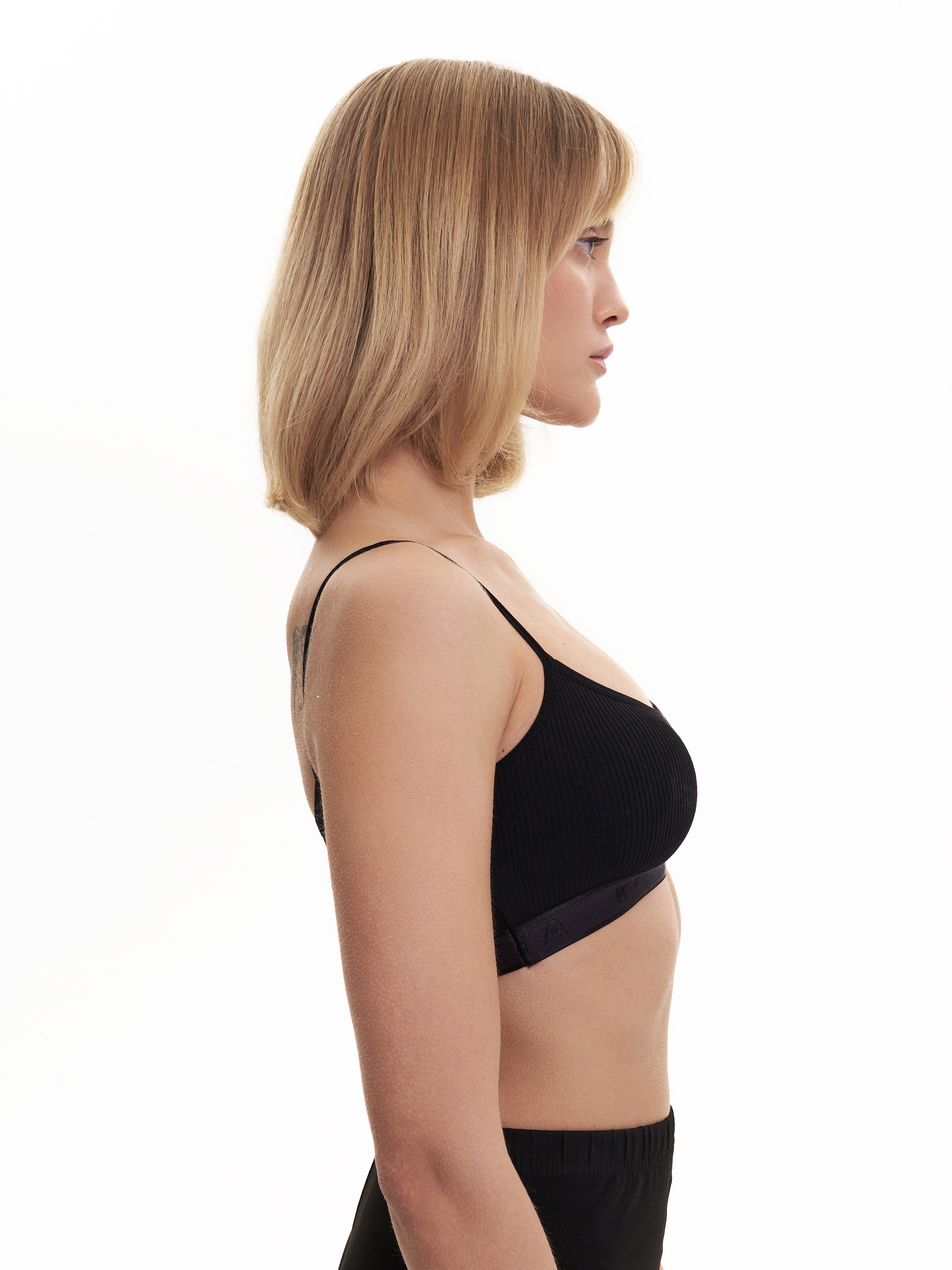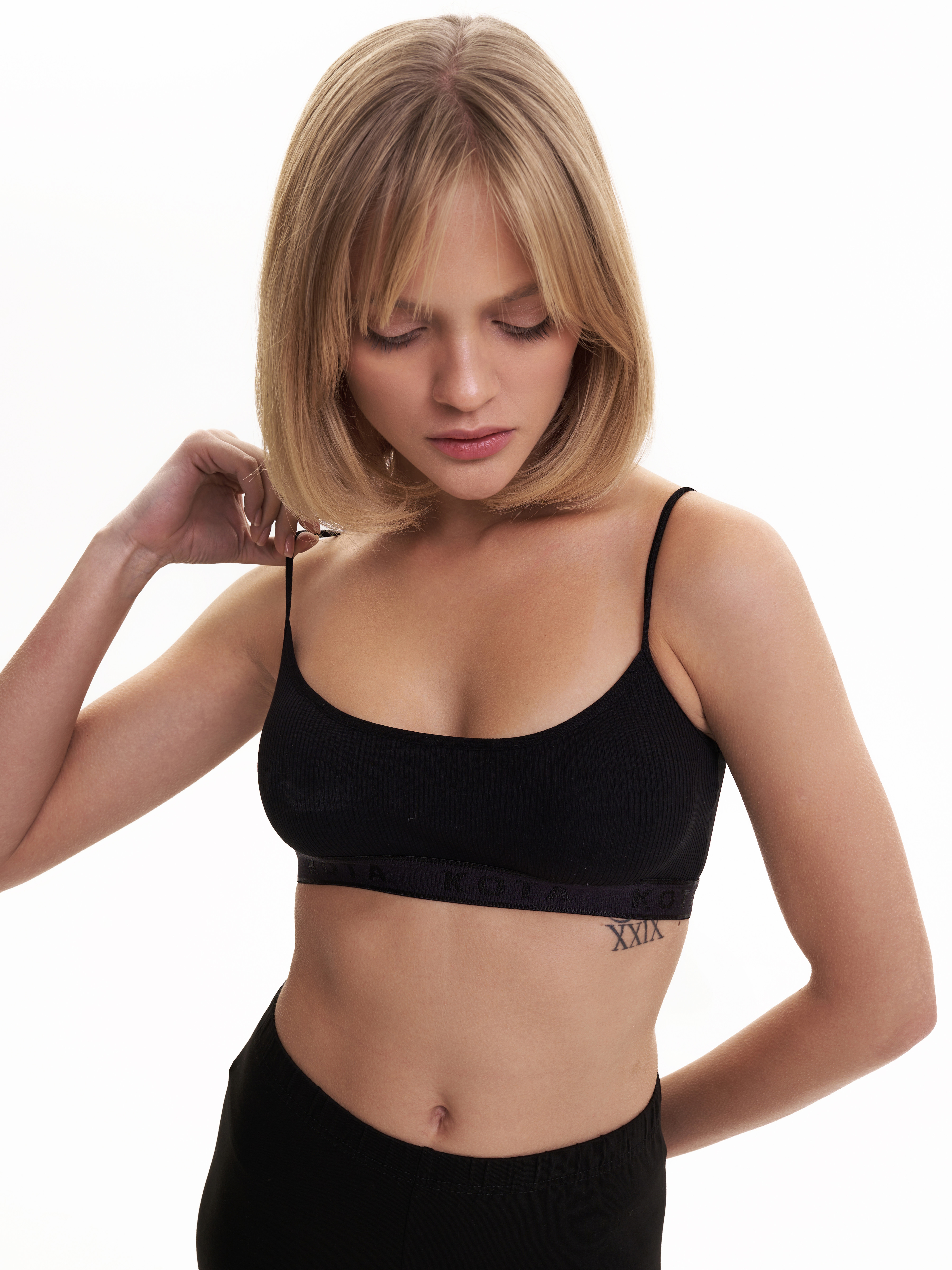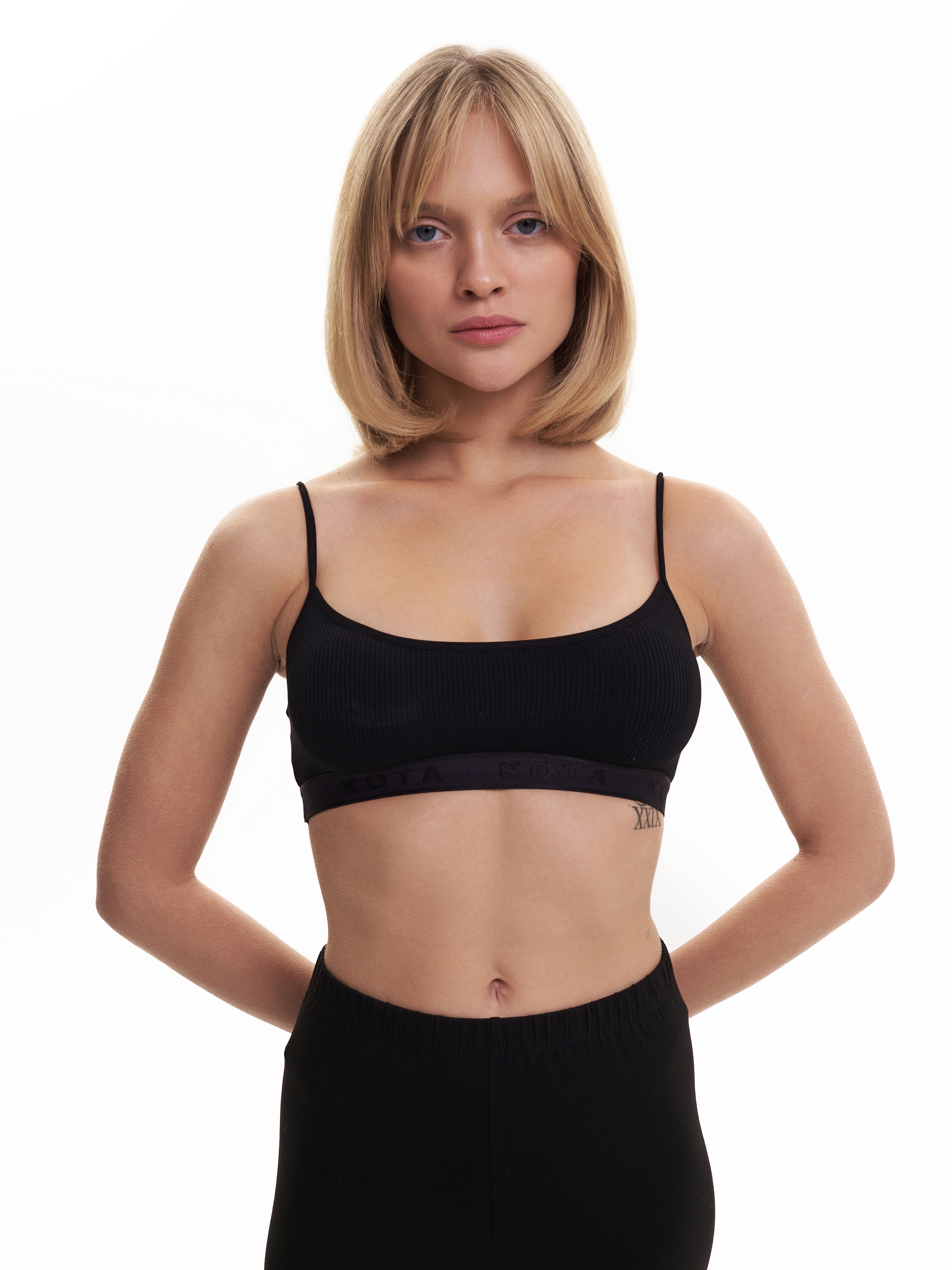 Спортивный укороченный топ Kota черного цвета на тонких бретелях. Ткань в рубчик.