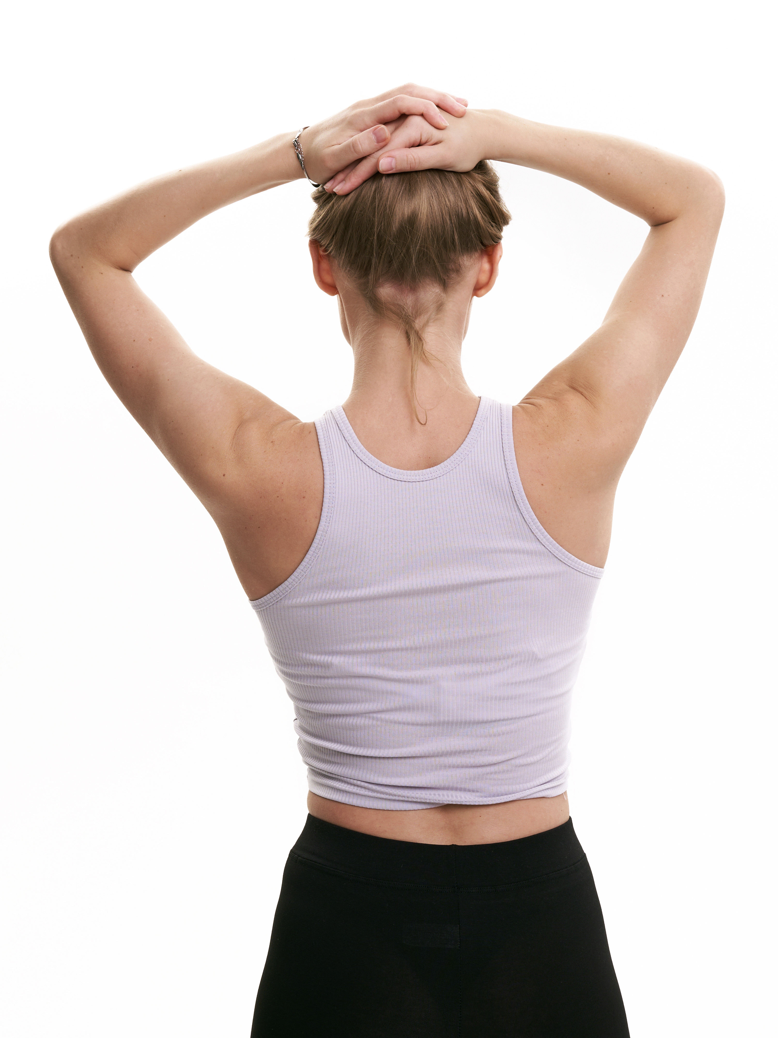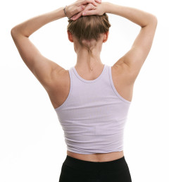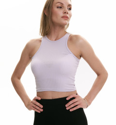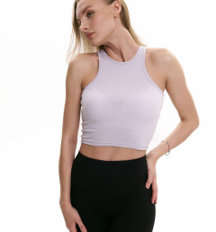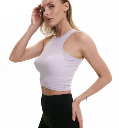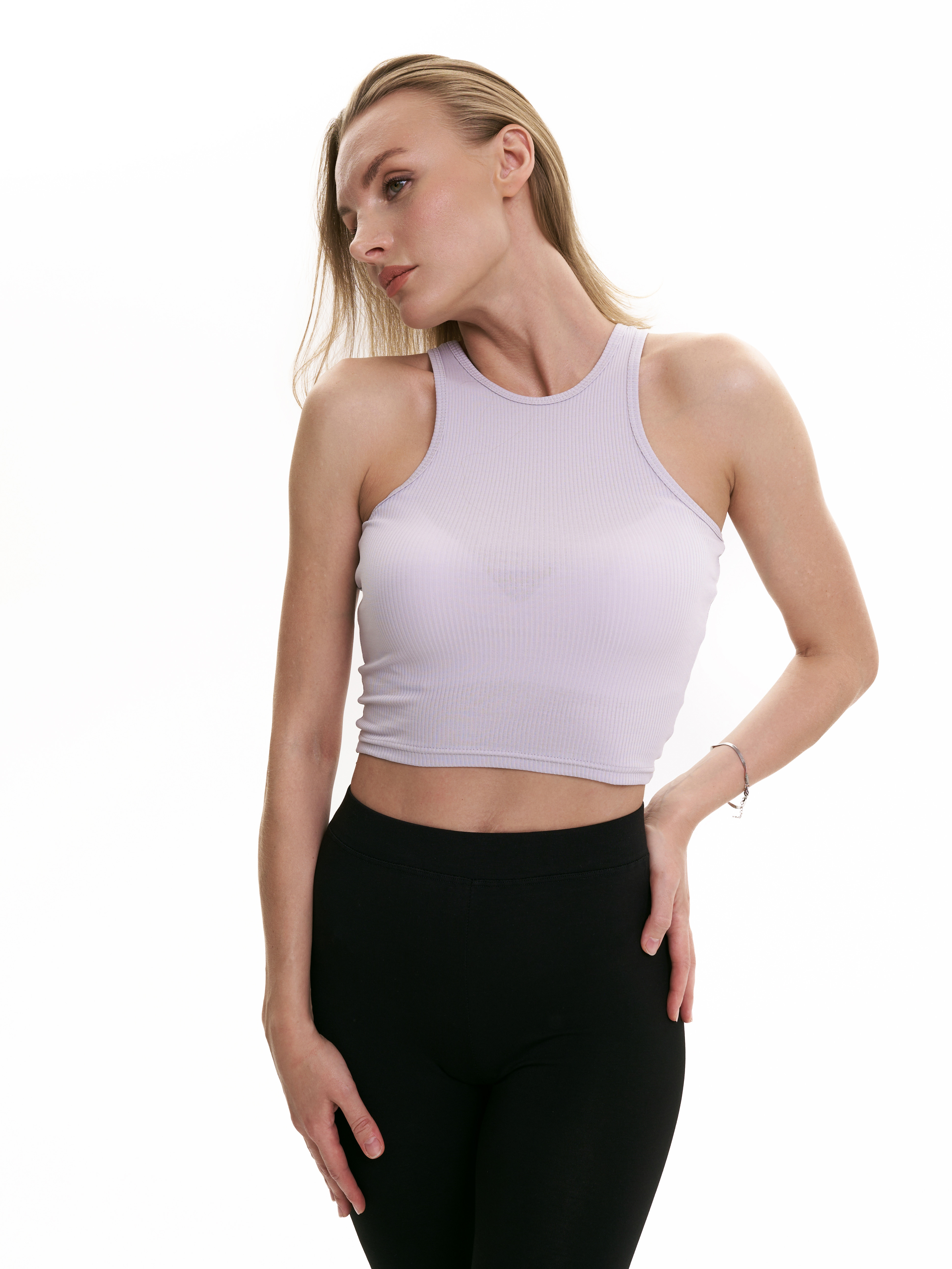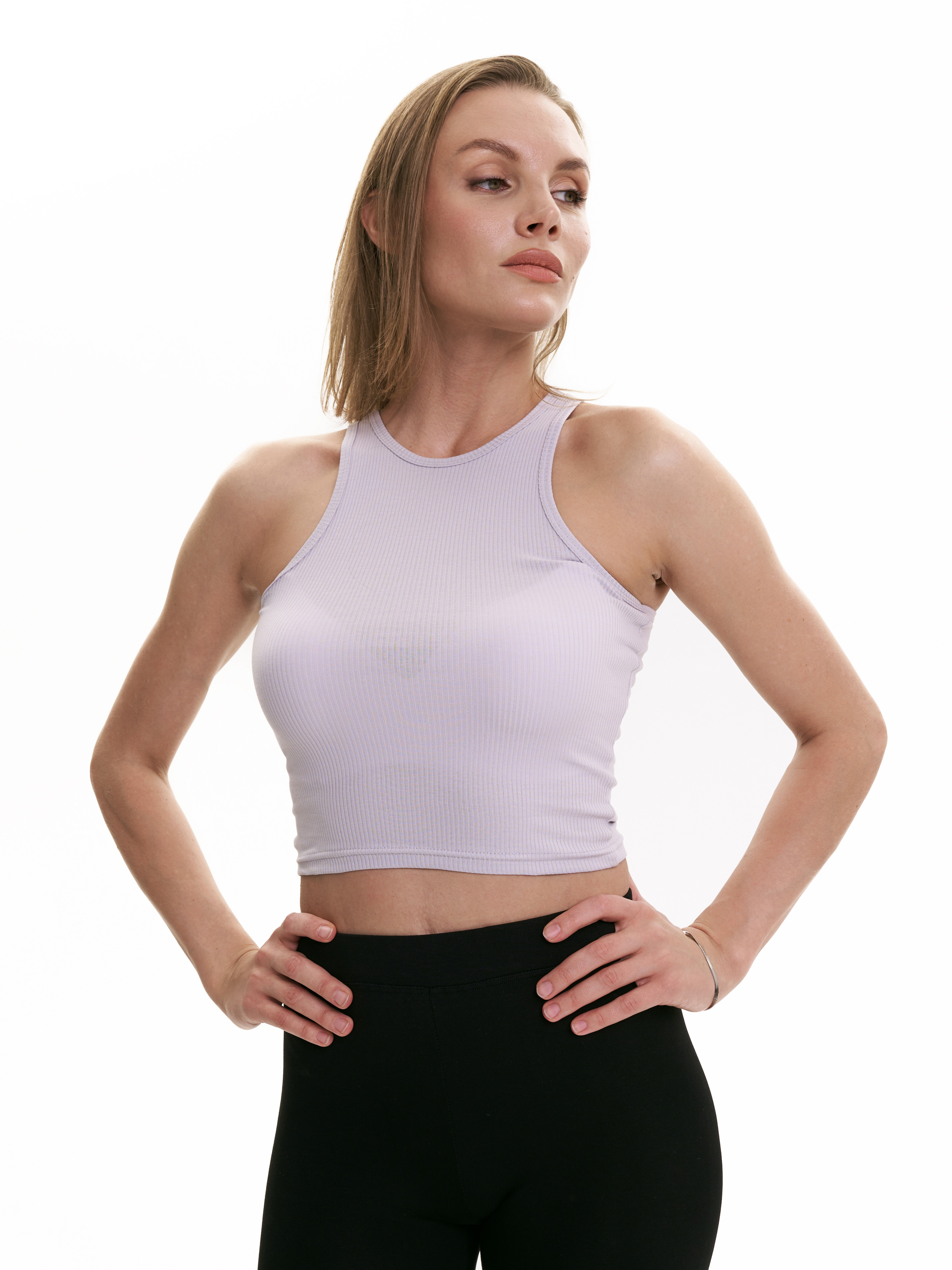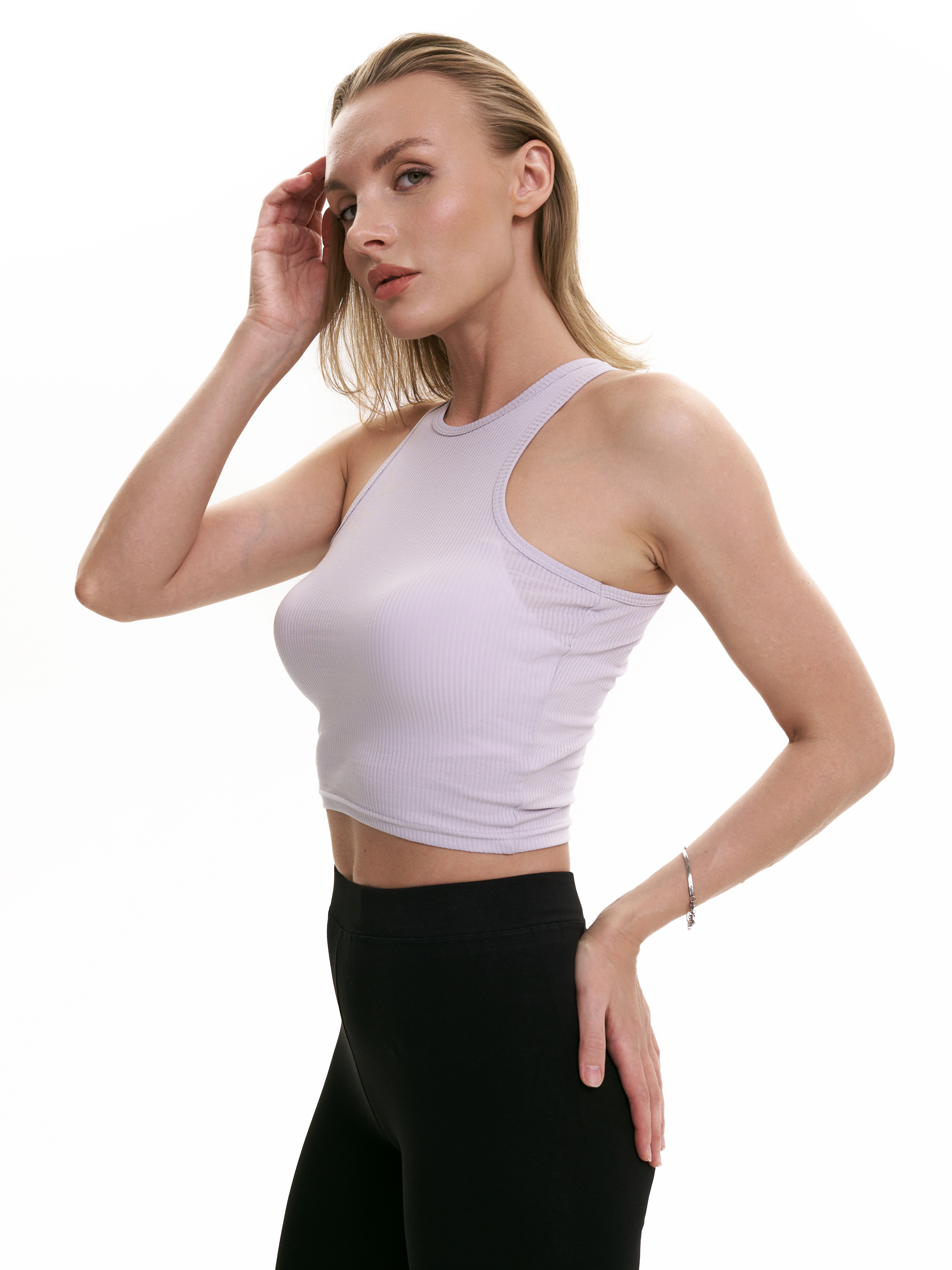 Спортивный кроп топ Kota серого цвета на широких бретелях. Ткань в рубчик. Неклассическая спина борцовка.